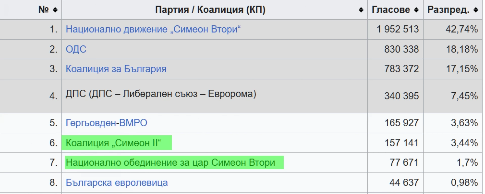 Опитът за регистрация на фалшиви двойници, които да черпят от легитимността и популярността на нови партийни играчи, започна именно с появата на Царя през 2001 г. Тогава на парламентарните избори оригиналното НДСВ получав над 1 милион 950 хиляди гласа, което осигурява на формацията точно 120 депутати. Любопитната подробност обаче е, че Сакскобургготски е ощетен с поне 230 хиляди гласа именно заради дейността на две партии, които трупат гласове на гърба на неговата популярност. Това лишава и НДСВ от нужното самостоятелно мнозинство и което принуждава формацията да потърси впоследствие подкрепата на ДПС на Ахмед Доган за широко коалиционно правителство.