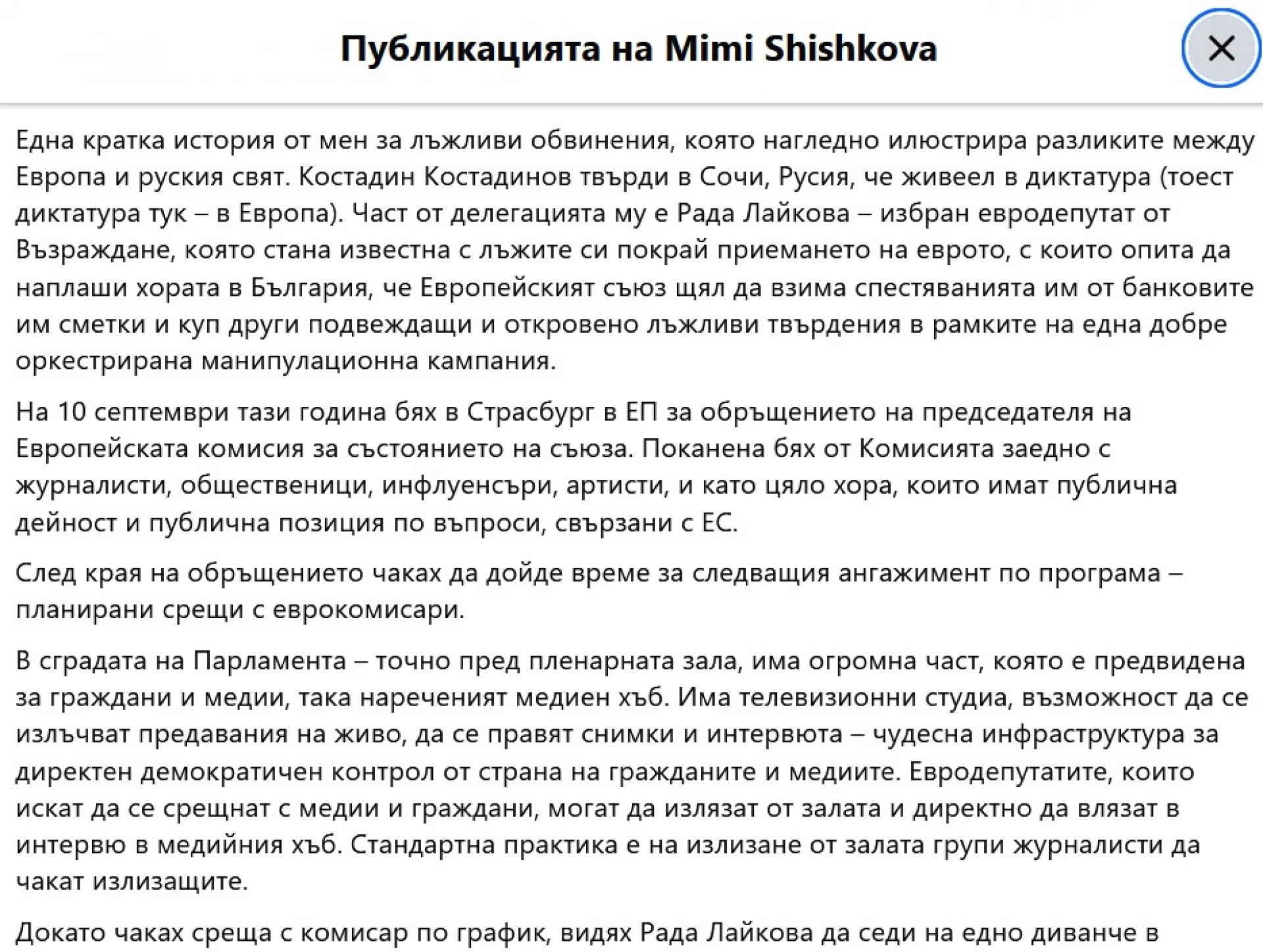 Беше проведено разследване, бяха разпитани свидетели, за да се потвърди, че всъщност Рада Лайкова се държа неуместно и ми крещя пред десетки души, докато аз просто и задавах въпроси – мое демократично право като свободен гражданин на свободна България в свободната за медии и граждани част на Европейския парламент. Това е най-съществената част от разказ на българската инфлуенсърка Мими Шишкова - разказът е споделен в личния ѝ профил във Facebook.