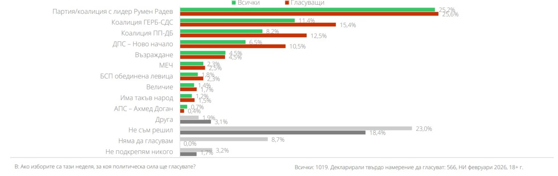 Новата формация, ръководена от Румен Радев, би получила подкрепата на 25.6% от гласовете, ако изборите са днес. Това показва проучване на Маркет линк, проведено в периода 7 - 13 февруари 2026 г. сред 1019 лица над 18 г. в страната чрез пряко-лично интервю и онлайн анкета . То е финансирано и реализирано съвместно от bTV и Маркет линкс.