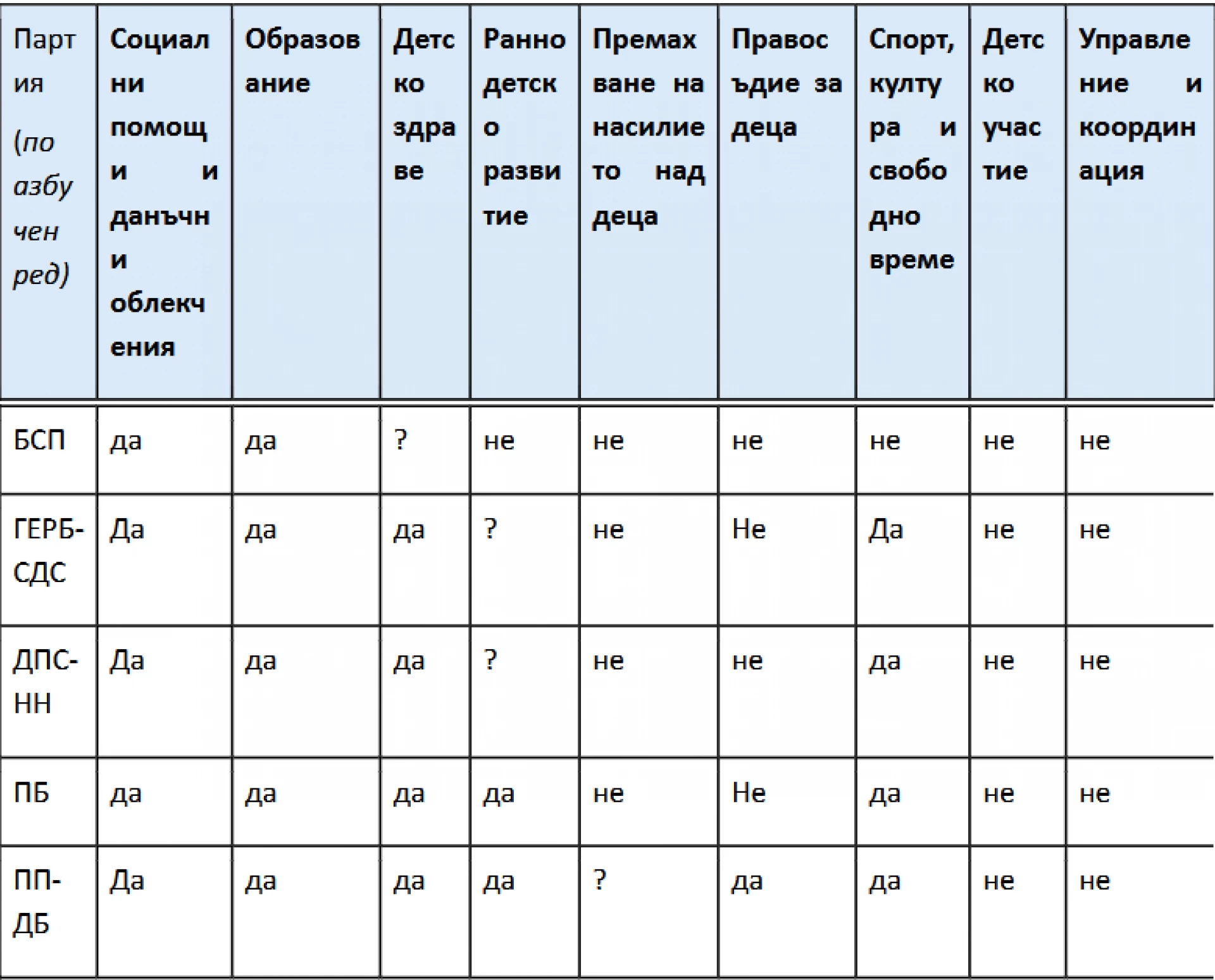 В поредната предизборна кампания от Национална мрежа за децата (НМД) отново анализираме програмите на партиите, които според предварителните резултати имат шанс да станат част от 52-ото Народно събрание. Анализът обхваща както големите теми за лидерството в детските политики, насилие, семейна политика, справяне с детската бедност, така и секторните теми като здравеопазване, образование, социална подкрепа и правосъдие.