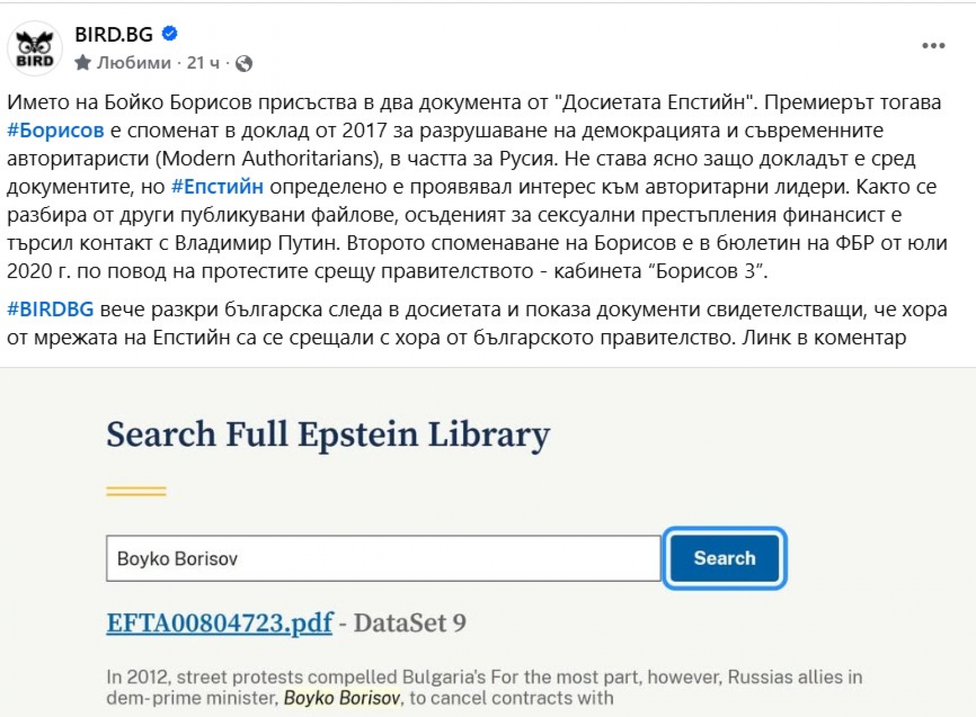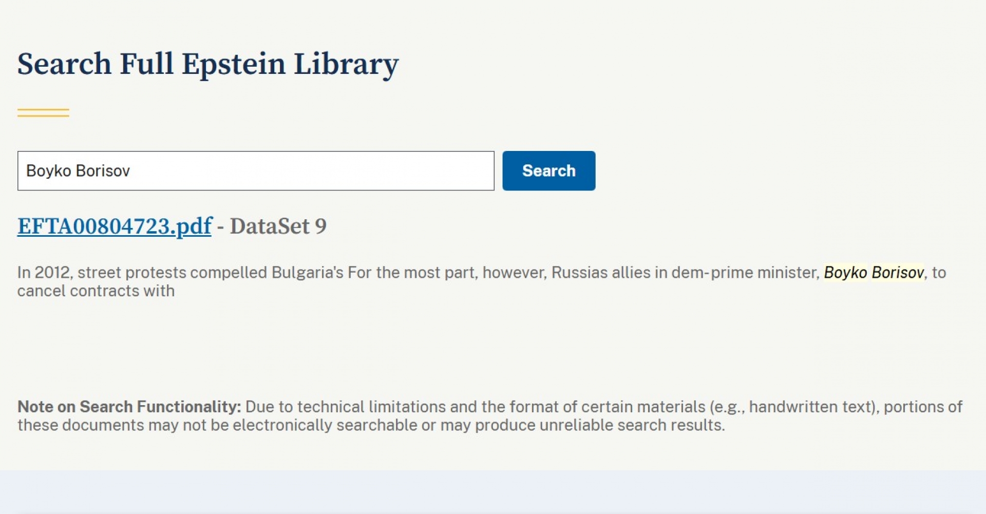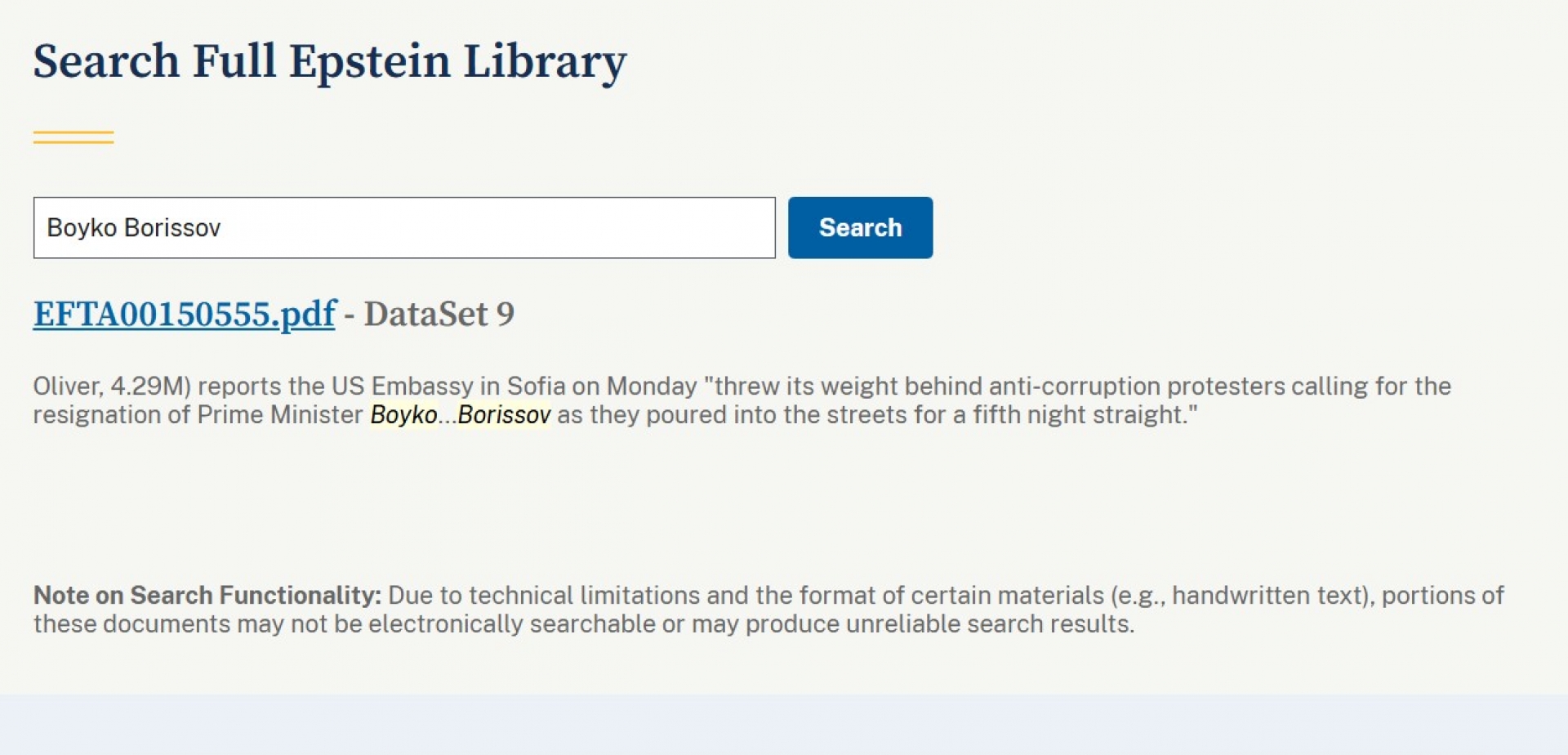 Разбира се, попадането на името на бившия премиер в досиетата "Епстийн" не означава по никакъв начин връзка с покойния финансист, нито е престъпление. На появата на Борисов във файловете внимание обърна разследващата медия BIRD.bg, а справка в търсачката на правосъдното министерство на САЩ потвърждава това (вижте тук и тук).
