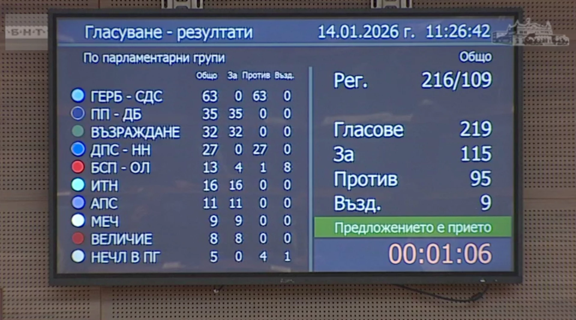 Законопроектът бе подкрепен от 115 депутати, 95 гласуваха "против", а 9 се въздържаха, от общо 219 гласували. Срещу промените се обявиха парламентарните групи на ГЕРБ и "ДПС-Ново начало", един народен представител от БСП, както и няколко независими депутати.