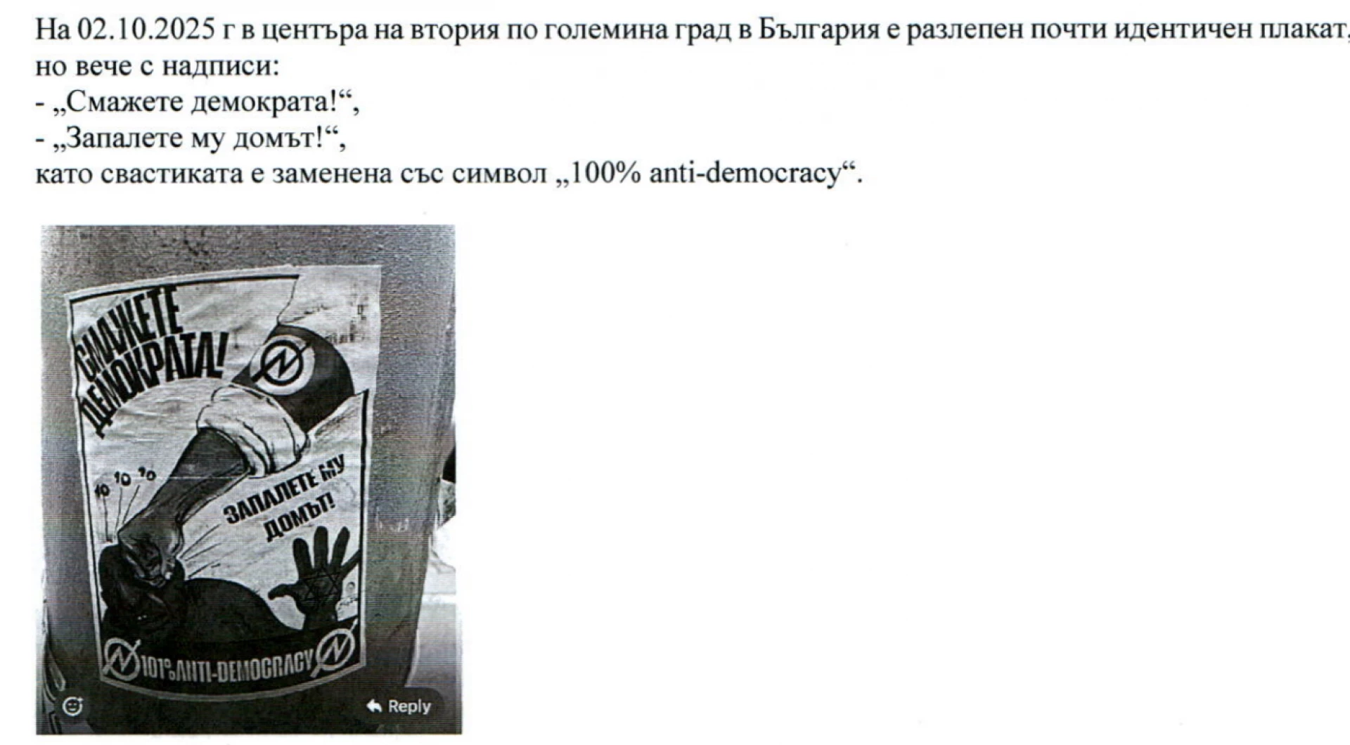 Според Иванов предходния ден (1 октомври) в района на Шишковата градина във Варна са разлепени плакати със съдържание, възпроизвеждащо класическа нацистка пропаганда от 30-е години на XX век. Той изброява кои са оригиналните реплики и символи по плаката отпреди век и го сравнява със сегашния, който е репродукция на историческата версия, но със репликите: "Смажете демократа!" и "Запалете му домът!". На мястото на свастиката пък е сложен символ "100% анти-демократичен" на английски език. Иванов прилага и снимка от разлепен плакат.