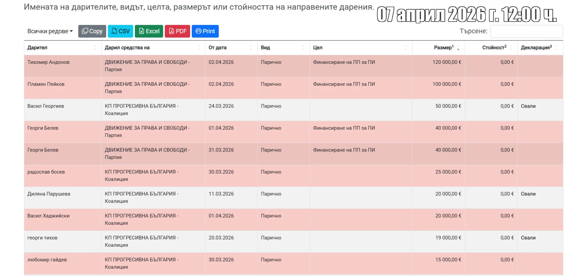 Десет дни преди края на предизборната кампания за предсрочните парламентарни избори на 19 април коалицията "Прогресивна България" е привлякла рекордните 597 950,11 евро под формата на дарения за вота, показва справка на Actualno.com в регистъра на Сметната палата. Общо малко над 910 хиляди евро е общата сума, получена като дарения за всички политически субекти към 7 април по обяд, което означава, че над половината дарения са именно към формацията на президента Румен Радев. Като абсолютен брой това се равнява на 454 броя дарения от общо 493, показва още проверката на Actualno.com.