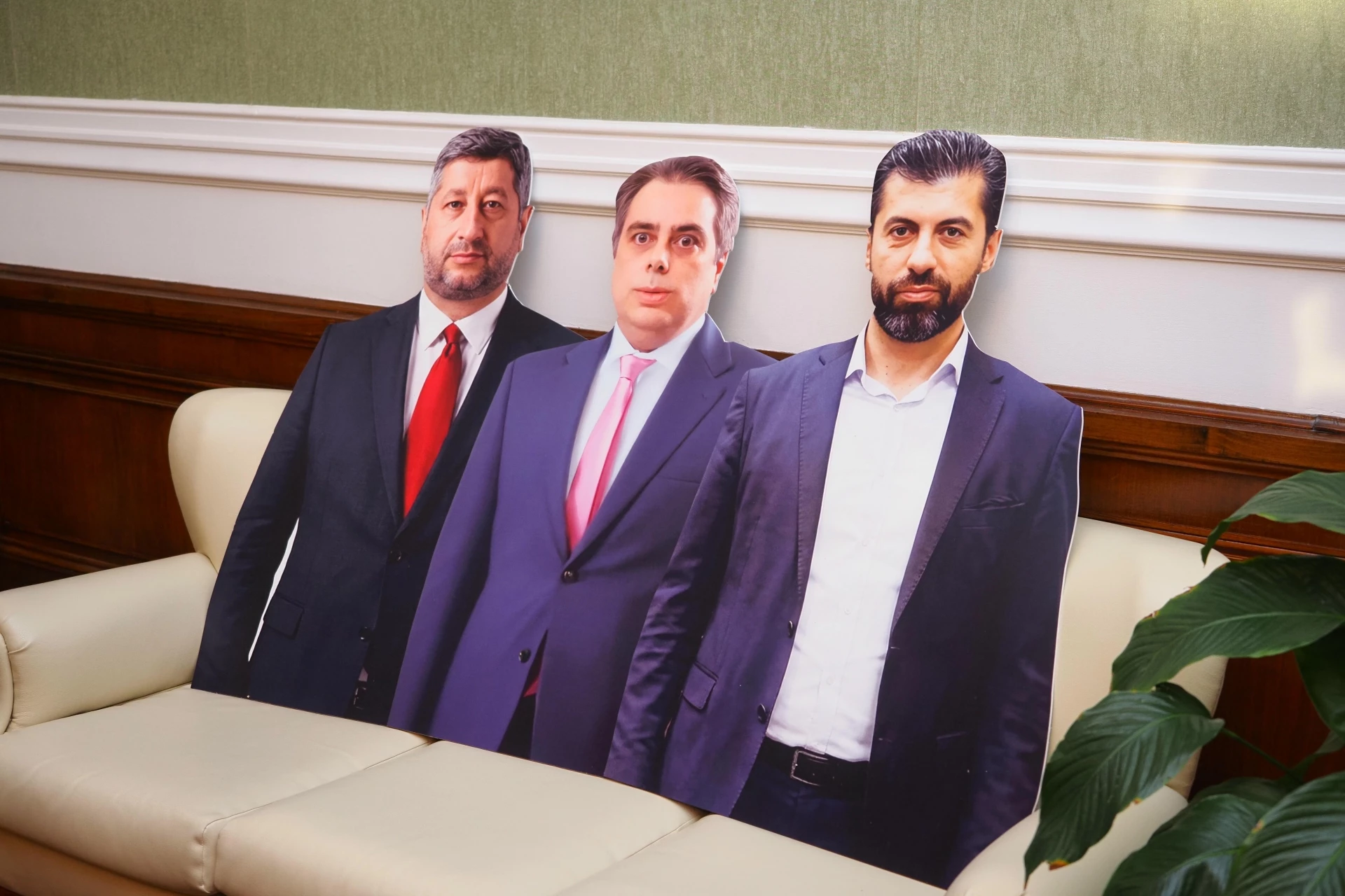 Там имаше трансперанти на Христо Иванов, Кирил Петков и Асен Василев, а на масичката пред тях - беше сервирано кафе.
