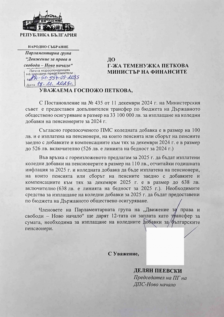 В писмото Пеевски припомня, че с правителствено постановление през декември 2024 г. бе предоставен допълнителен трансфер по бюджета на Държавното обществено осигуряване в размер на 33 100 000 лева за изплащане на коледни добавки на пенсионерите за съответната година. Тогава добавката беше по 10 лв. за пенсионери, на които пенсията или сборът на пенсиите заедно с добавките и компенсациите към тях за декември 2024 г. бе в размер до 526 лв. – линията на бедност.
