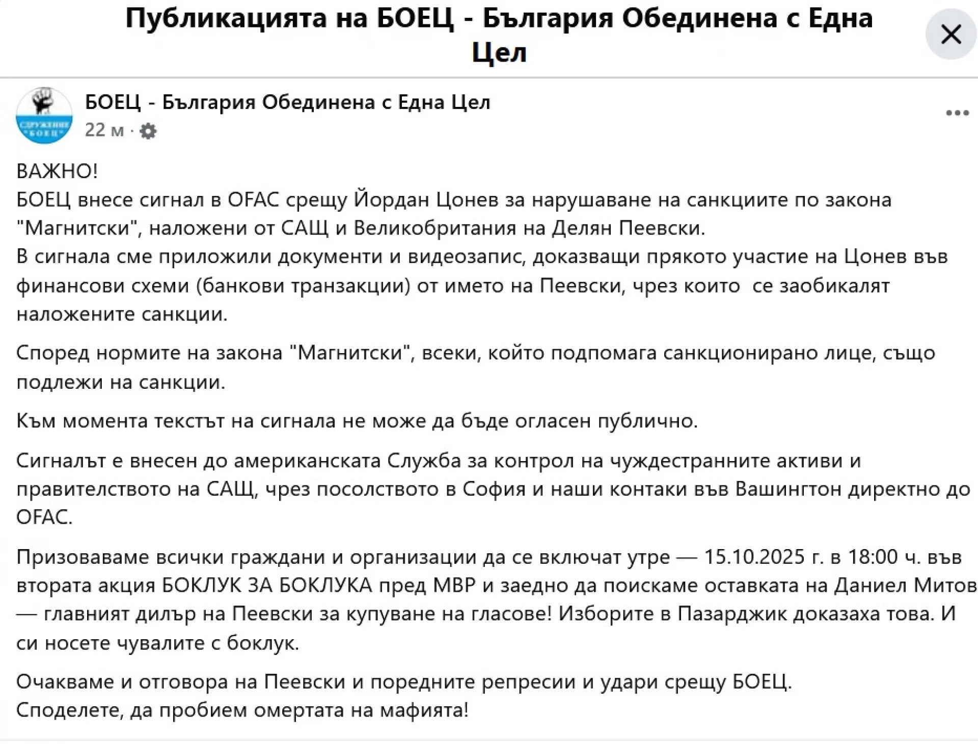 "БОЕЦ внесе сигнал в OFAC срещу Йордан Цонев за нарушаване на санкциите по закона "Магнитски", наложени от САЩ и Великобритания на Делян Пеевски. В сигнала сме приложили документи и видеозапис, доказващи прякото участие на Цонев във финансови схеми (банкови транзакции) от името на Пеевски, чрез които се заобикалят наложените санкции. Според нормите на закона "Магнитски", всеки, който подпомага санкционирано лице, също подлежи на санкции". Такова съобщение се появи в официалната страница на Facebook на гражданското движение БОЕЦ.