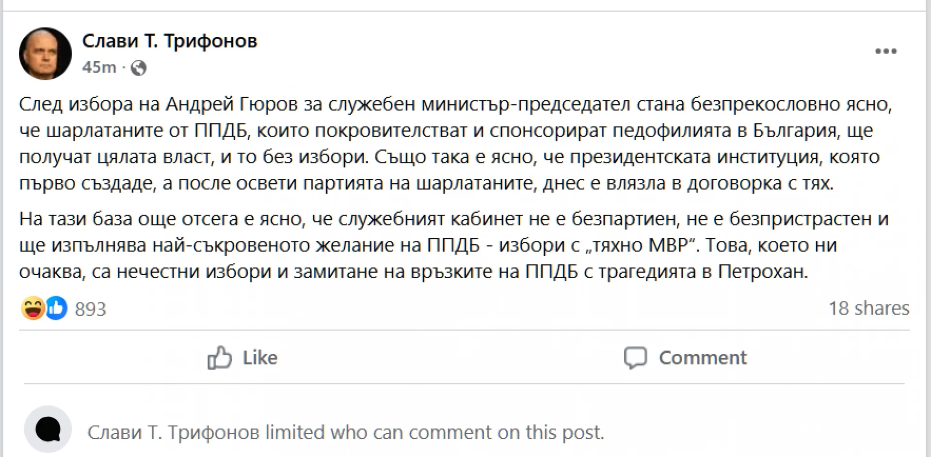 "След избора на Андрей Гюров за служебен министър-председател стана безпрекословно ясно, че шарлатаните от ПП-ДБ, които покровителстват и спонсорират педофилията в България, ще получат цялата власт, и то без избори", написа в социалните мрежи лидерът на "Има такъв народ" (ИТН) Слави Трифонов. Традиционно той е спрял възможността за коментари под публикацията си, а текстът е събрал множество осмиващи реакции.
