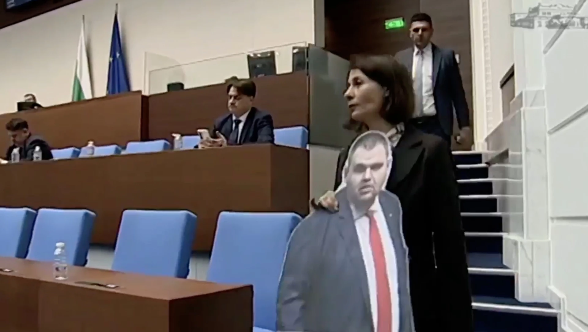Депутатът от "Продължаваме промяната - Демократична България" Елисавета Белобрадова постави в пленарната зала картонена фигура на санкционирания за корупция от САЩ и Великобритания лидер на "ДПС-Ново начало" Делян Пеевски на неговото депутатско място. Причината - депутатът не присъства на заседанието.