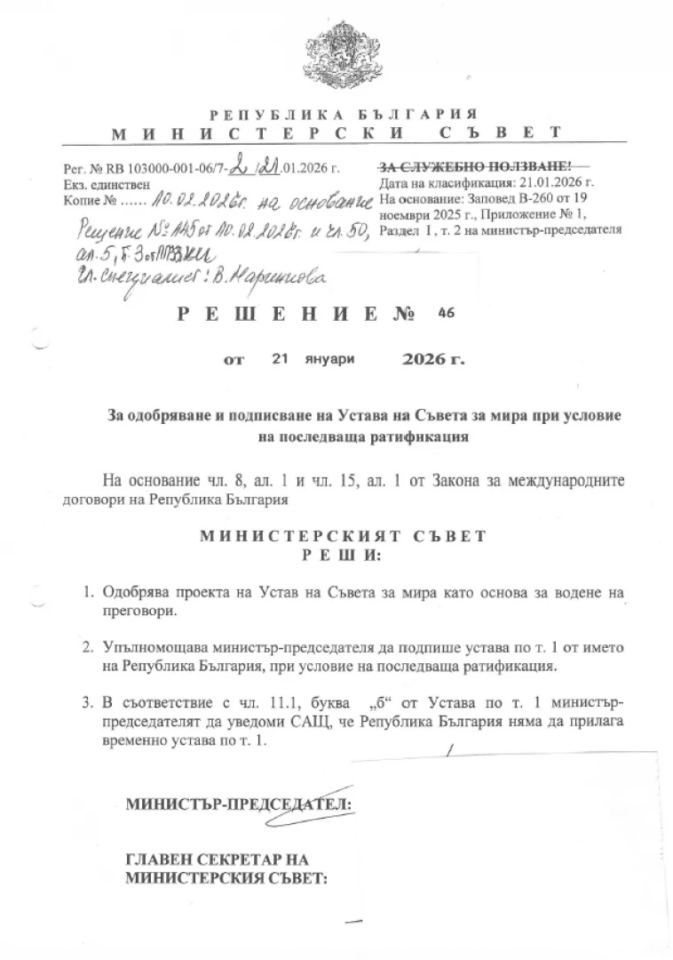 Кабинетът "Желязков" публикува решението си за присъединяване към Съвета за мир, иницииран от президента на САЩ Доналд Тръмп. Припомняме, че България и Унгария бяха единствените страни от Европейския съюз, които се включиха в организацията на Тръмп, наречена ООН-2. Това стана въпреки "сериозните съмнения" и резерви, които ЕС има относно спорната организация.