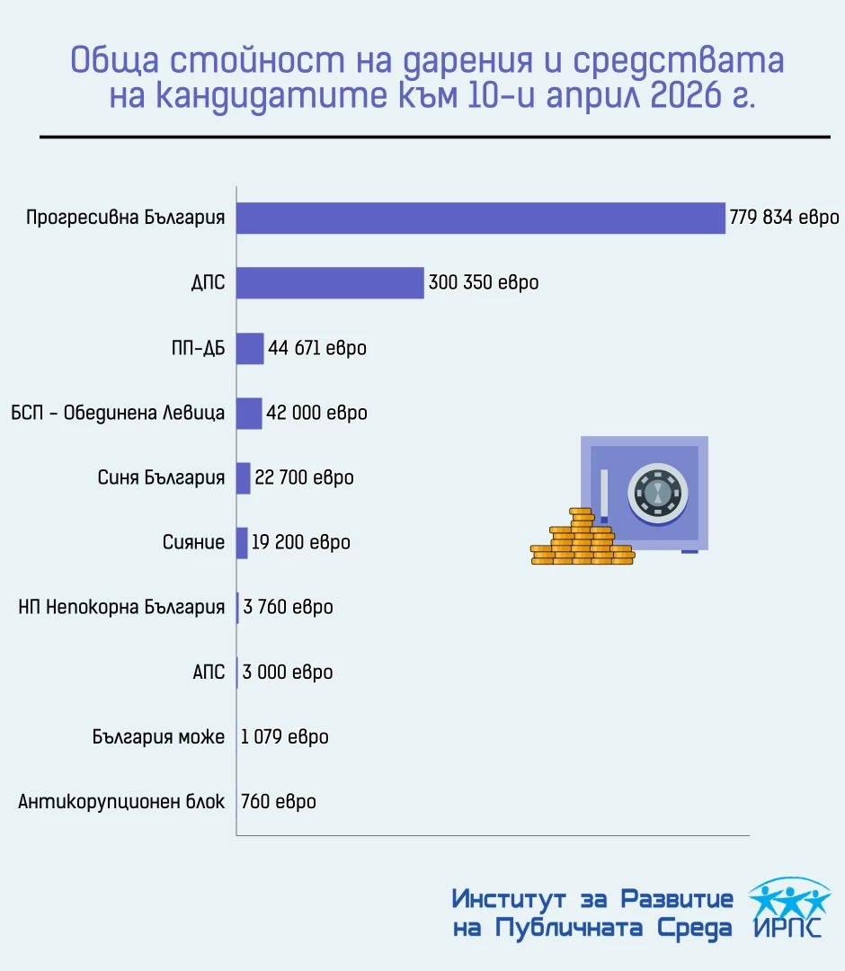 В третата седмица на предизборната кампания средствата, насочени към участниците нарастват. Към 10-и април 2026 г. формациите са привлекли общо 1 217 354 евро от симпатизанти и кандидати, отчита Институтът за развитие на публичната среда. По осем формации са получили дарения от физически лица и средства от кандидатите в своите листи. Данните показват, че формацията на Румен Радев „Прогресивна България“ е получила 779 834 евро дарения към 10 април, на второ място е ДПС на Делян Пеевски с 300 350 евро дарения, следвани от ПП-ДБ с 44 671 евро и „БСП – Обединена левица“ с 42 000 евро.