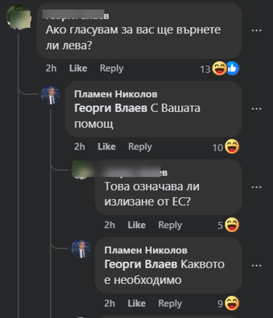 По-интересни обаче са коментарите на Николов за еврото. Под публикацията му попадаме на следните текстове, в които бившият кандидат за премиер се обръща към един от потребителите и обяснява как "с вашата помощ" ще върне лева:
