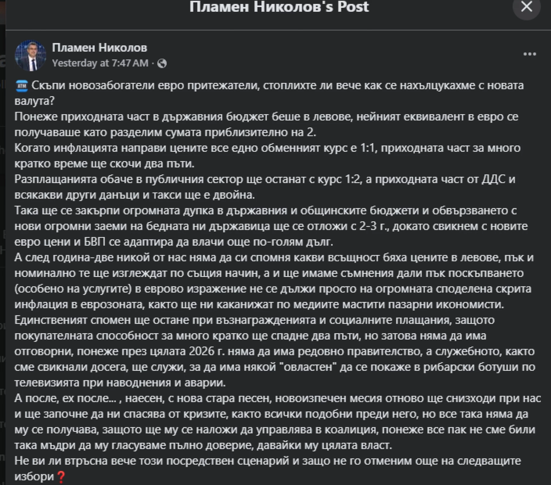 Сега, близо три години и половина по-късно, Николов сподели плакат на партия "Възраждане" и доста любопитни коментари по отношение на еврозоната.