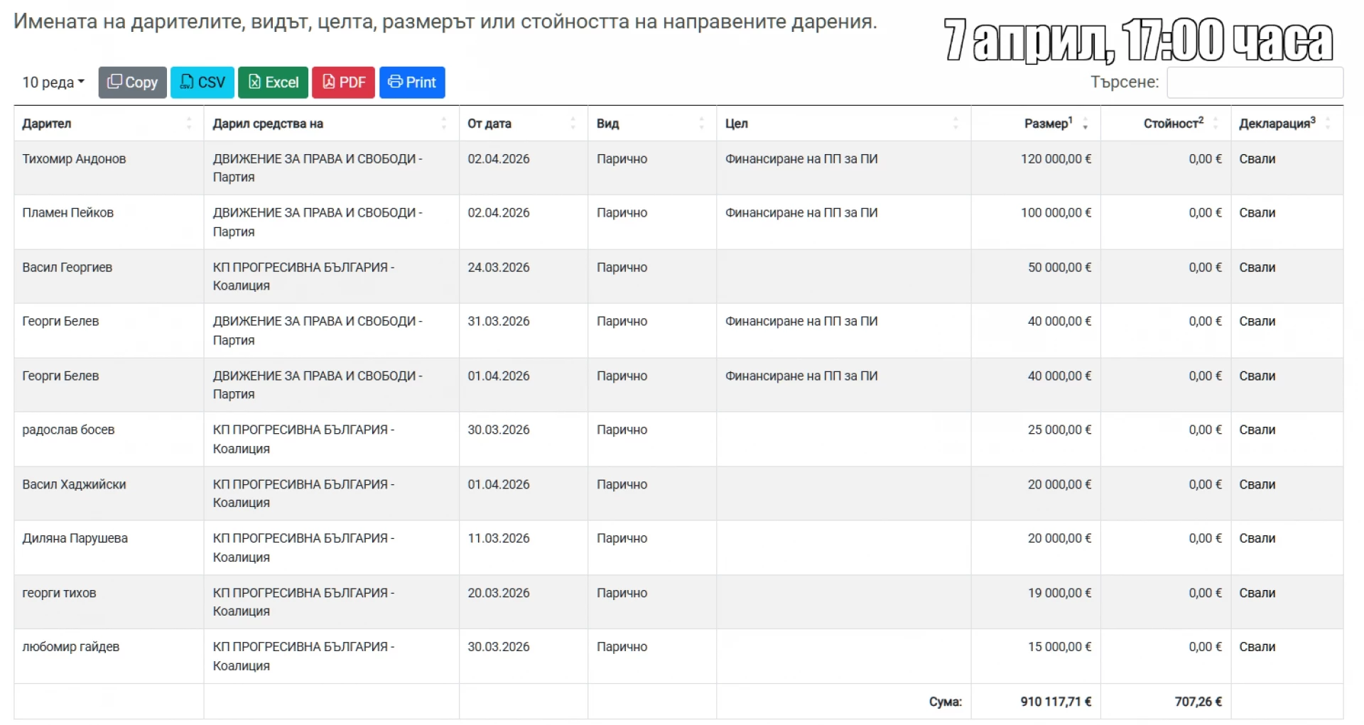 Сметната палата обнови данните в единния регистър, отразяващ всички договори на политическите формации и получените от тях дарения за предизборната кампания за предсрочните парламентарни избори на 19 април след материал на Actualno.com. Предисторията - по-рано в сряда в обширен материал представихме справка за получените огромни суми под формата на дарения към коалиция "Прогресивна България". Формацията на президента Румен Радев е привлякла рекордните 597 950,11 евро под формата на дарения за вота и то при общо малко над 910 хиляди евро обща сума за дарения към всички политически субекти.