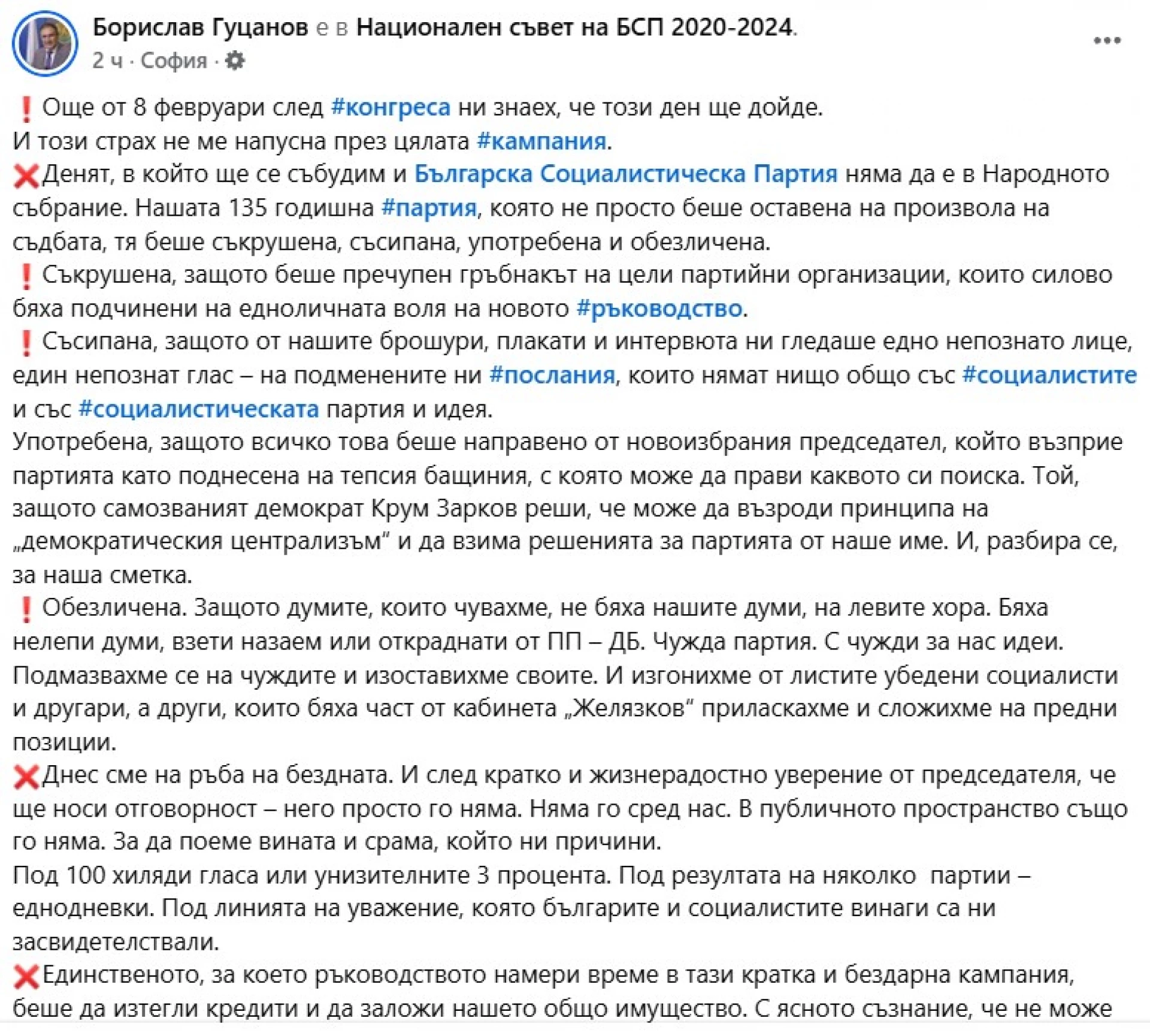 Лидерът на БСП Крум Зарков да подаде незабавно оставка. Това призова членът на Изпълнителното бюро и на Националния съвет на БСП Борислав Гуцанов. Той обвини Зарков в "еднолично управление и взимане на грешни решения, довели до изпадането им от парламента", написа бившият социален министър в профила си във Facebook. По думите му 135-годишната партия "не просто е била оставена на произвола на съдбата, тя беше съкрушена, съсипана, употребена и обезличена".