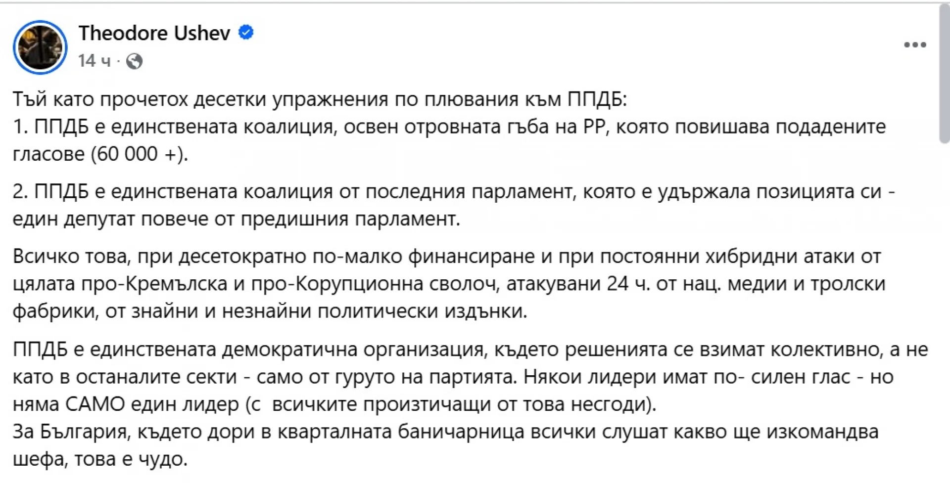 В свой пост във Фейсбук той отбелязва още, че "ППДБ е единствената коалиция, която ясно и нееднозначно заяви и поддържа про-Европейското демократично развитие на страната, подкрепа за Украйна и безкомпромисност по повод на корупцията, дори в своите собствени редици. (всичките тези компоненти звучат като гръм в главата на средно-статистическия бг гласоподавател, където и да се намира по света)"