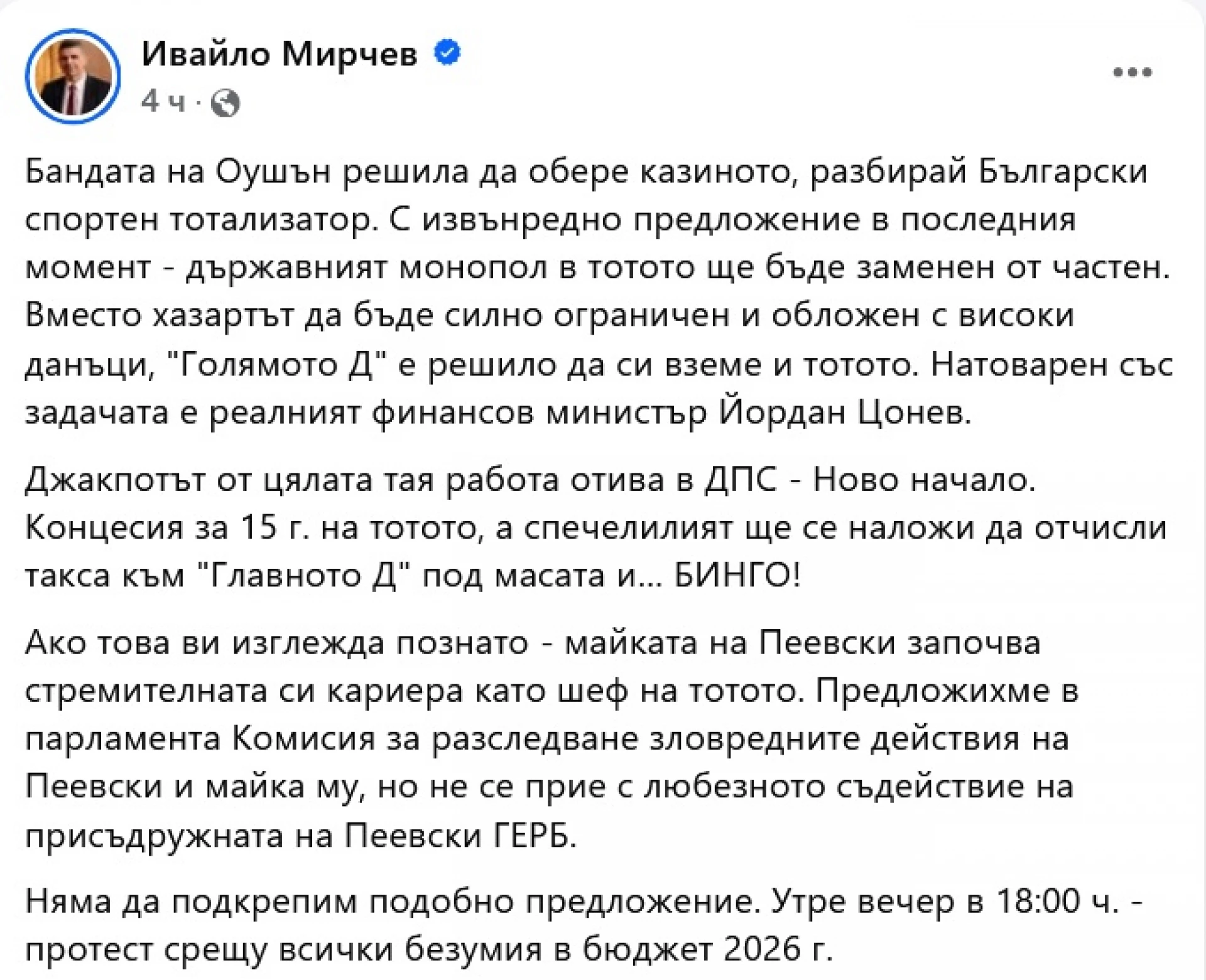 Депутатът от ПП-ДБ Ивайло Мирчев също се изказа в профила си във Facebook - с напомняне, че майката на Делян Пеевски записа "златни години" в професионалната си кариера като ръководител на Държавния спортен тотализатор":