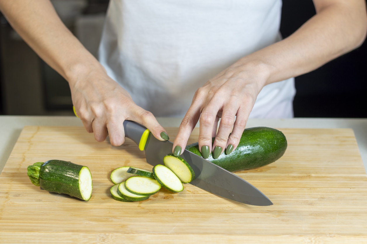За начало вземете млади тиквички – кората им е все още доста крехка, така че няма нужда да я белите. Разрежете всяка тиквичка наполовина по дължина, след което ги нарежете на парчета. Важно е тези парчета да не са твърде тънки, тъй като трябва да запазят формата си след готвене. Прехвърлете нарязаните тиквички в голяма тенджера.