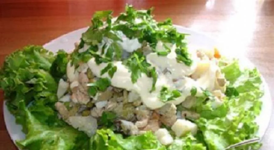 8. Поставете готовата салата върху листа от маруля и гарнирайте с магданоз и копър.