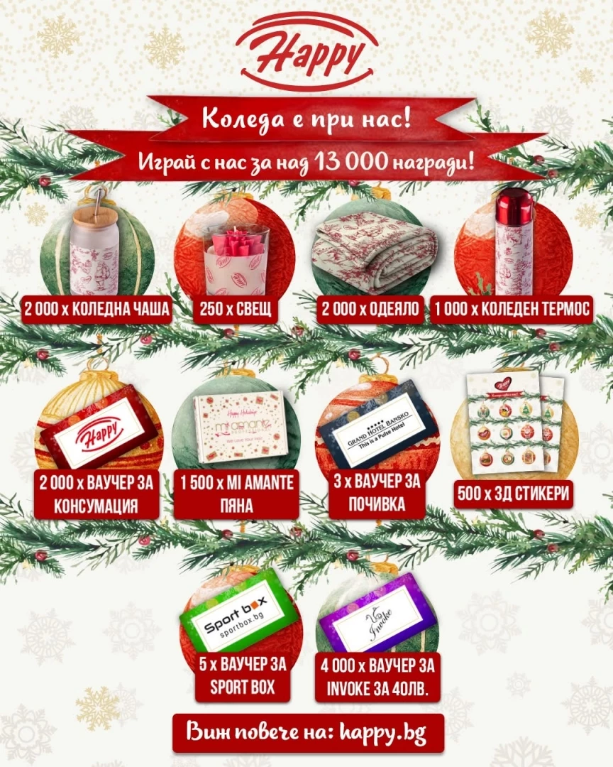 Няма как да пропуснем, че екипът на Happy обича изненадите и го доказва за пореден път. Този сезон веригата умножава радостта ни с малко коледно чудо - специалната игра “Коледа е при нас” обещава искрени усмивки и общо 13 000 награди.