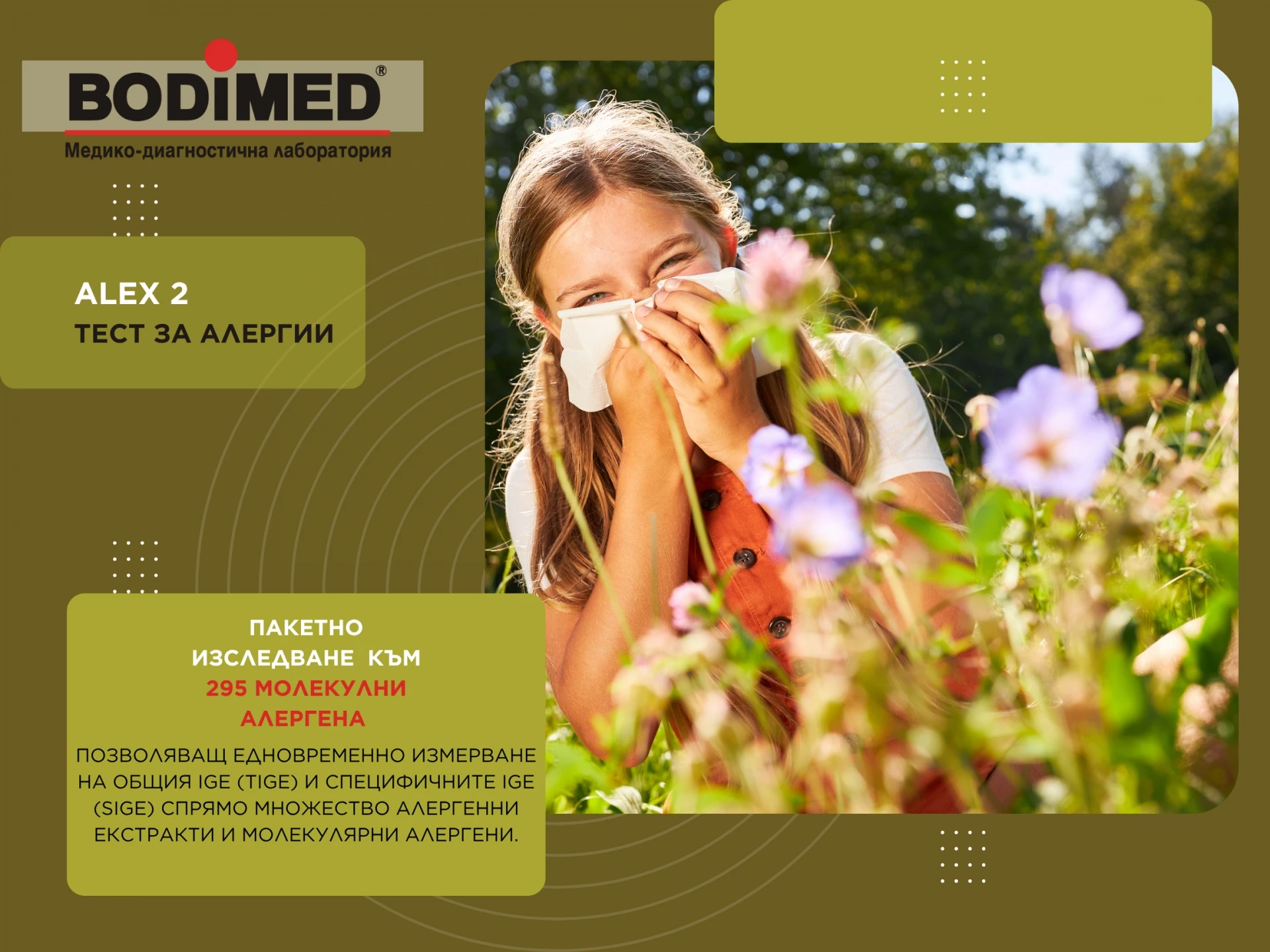 Защото нека признаем - често подценяваме симптоми като кихане, сълзене и зачервяване на очите, хрема или кожни реакции. Докато всъщност те могат да бъдат сигнал, че тялото реагира на външни дразнители. Затова лаборатория BODIMED предоставя най-подходящата възможност тези сигнали да бъдат разчетени правилно чрез съвременни изследвания. Тук тестът “Alex2” се откроява като иновативно решение, позволяващо едновременно измерване на алерген-специфичните IgE (sIgE) и общите IgE (tIgE) антитела чрез кръвна проба. Методът осигурява детайлен поглед върху реакциите към разнообразни алергени - от полени до микроскопични частици в околната среда, които често остават невидими за нас.