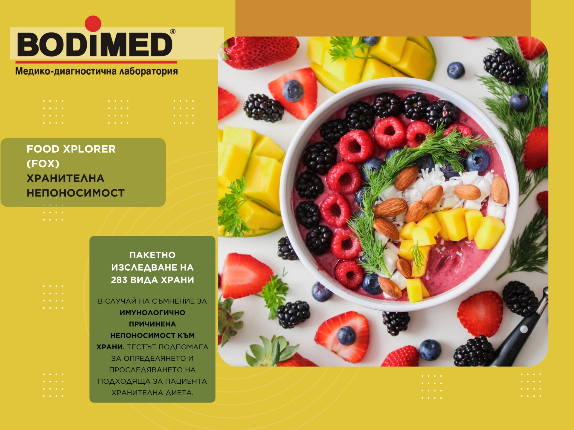 Вече 35 години BODIMED развива своята дейност с ясно изразен стремеж към прецизност и високо качество. Структурата на лабораторията обединява разнообразни диагностични направления, включително клинична лаборатория, хормони, туморни маркери, микробиология, паразитология, вирусология, имунология и цитология. Това от своя страна позволява цялостен и задълбочен анализ на здравословното състояние. А качеството на работа остава водещ приоритет, подкрепен от постоянното повишаване на квалификациите на специалистите.