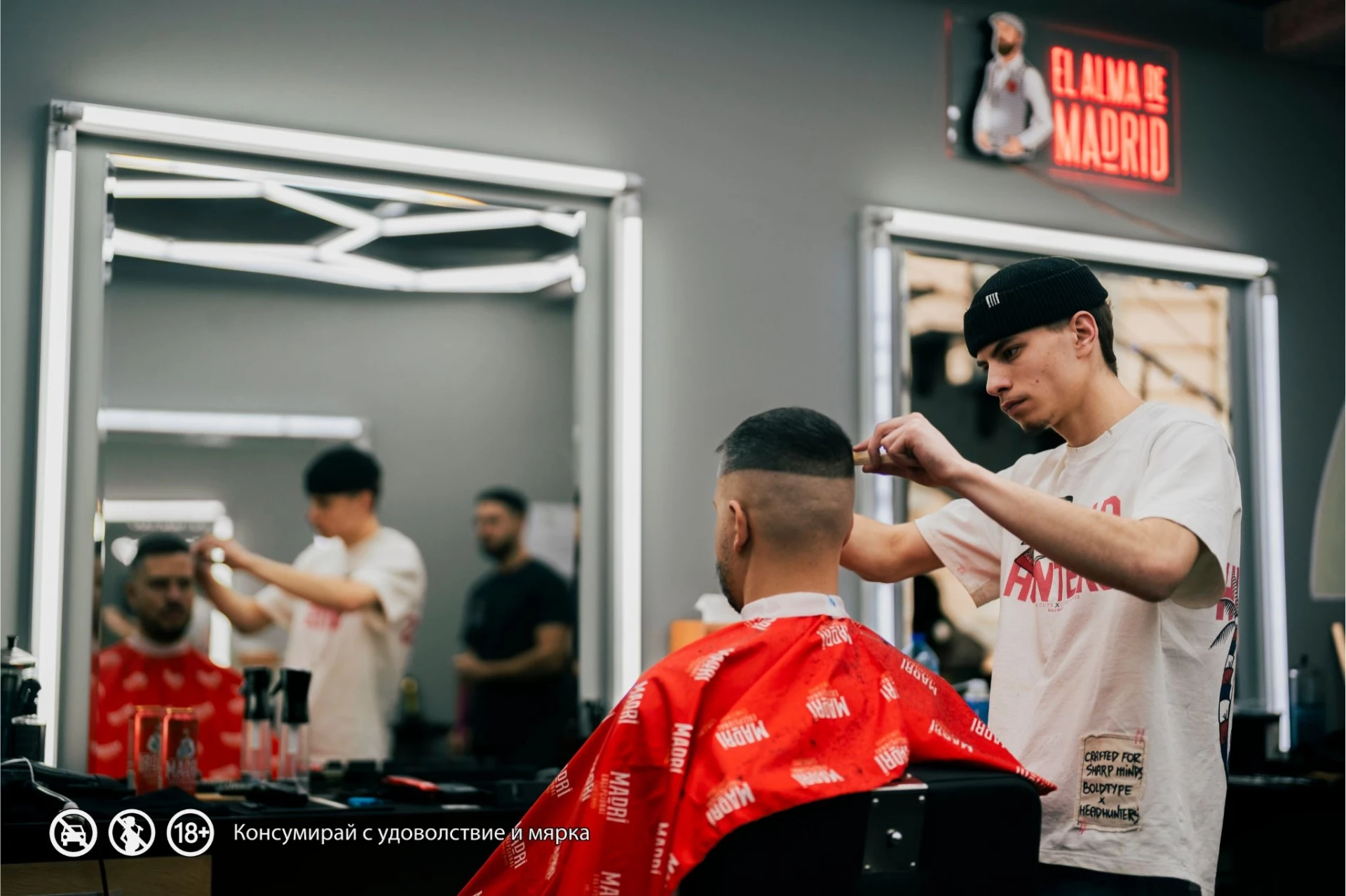 Там бръснарницата се превръща в сцена – стилът, атмосферата и вкусът се събират на едно място. Приятелски разговор, съвременна музика, добро настроение, качествена грижа и глътка Madrí като златен печат на градския ритуал.