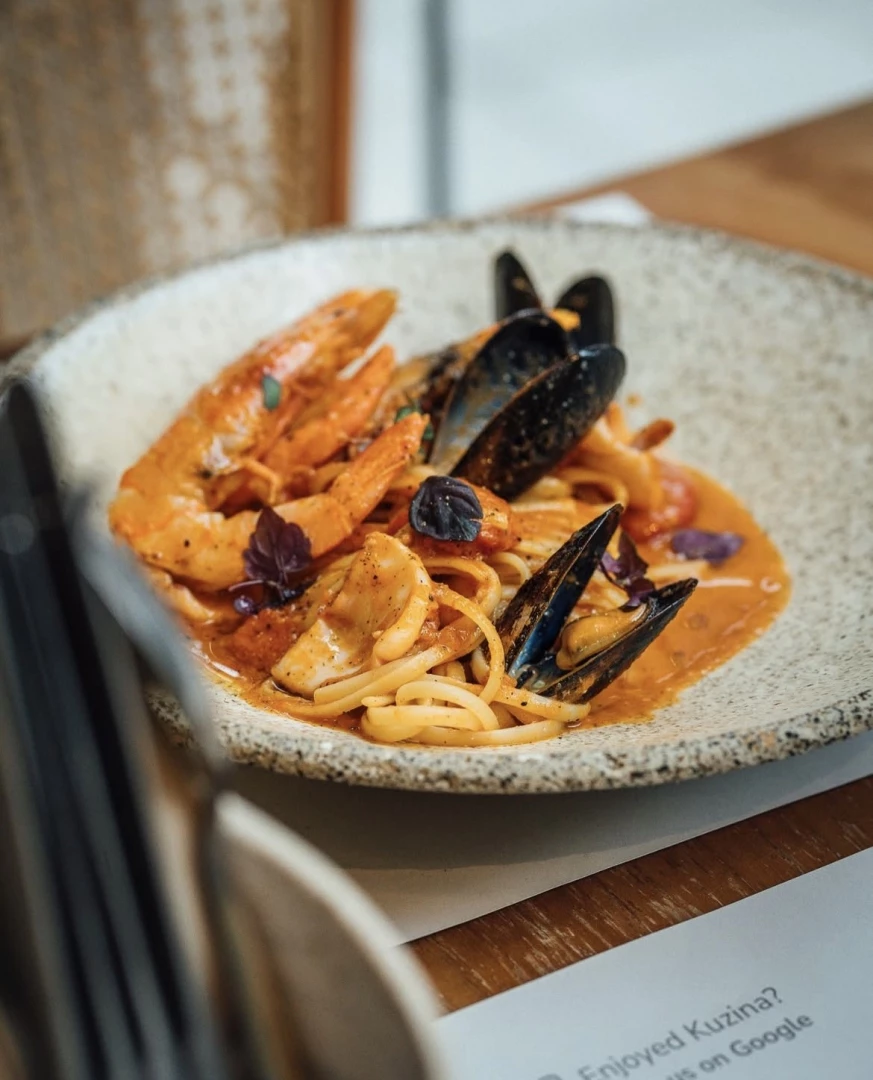 В Kuzina всяко ястие е малка история, която чака да бъде споделена. История за далечни острови, любими вкусове и незабравими спомени. Менюто пренася гостите от Крит до Пелопонес, от Миконос до Северна Гърция. А Шеф Стефанос Стамидис комбинира простотата на традиционните рецепти с модерно гурме изкуство. За начало свежата праcини салата с плодове, цитруси, мед и сирене „Тираки“ се усеща като първата целувка на морския бриз - лека, ароматна и пленяваща. Малките кюфтенца от тиквички с йогурт мус пък приканват към споделяне и усмивки. А за основно, вечерта може да поеме по два различни пътя - към морето или към земята. Сувлакито със сьомга и скариди акостира на масата право от Егейско море, а рибата на деня „Psari“ е още едно неустоимо изкушение от дълбините. Влюбихме се и в топлината на пастициото с бавно задушено телешко рагу с прясна паста и крем от гравиера.