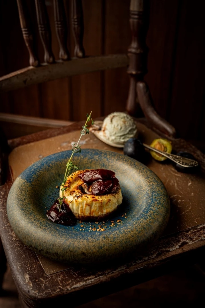 (Чийзкейк с кестени, сини сливи и горгонзола сладолед)