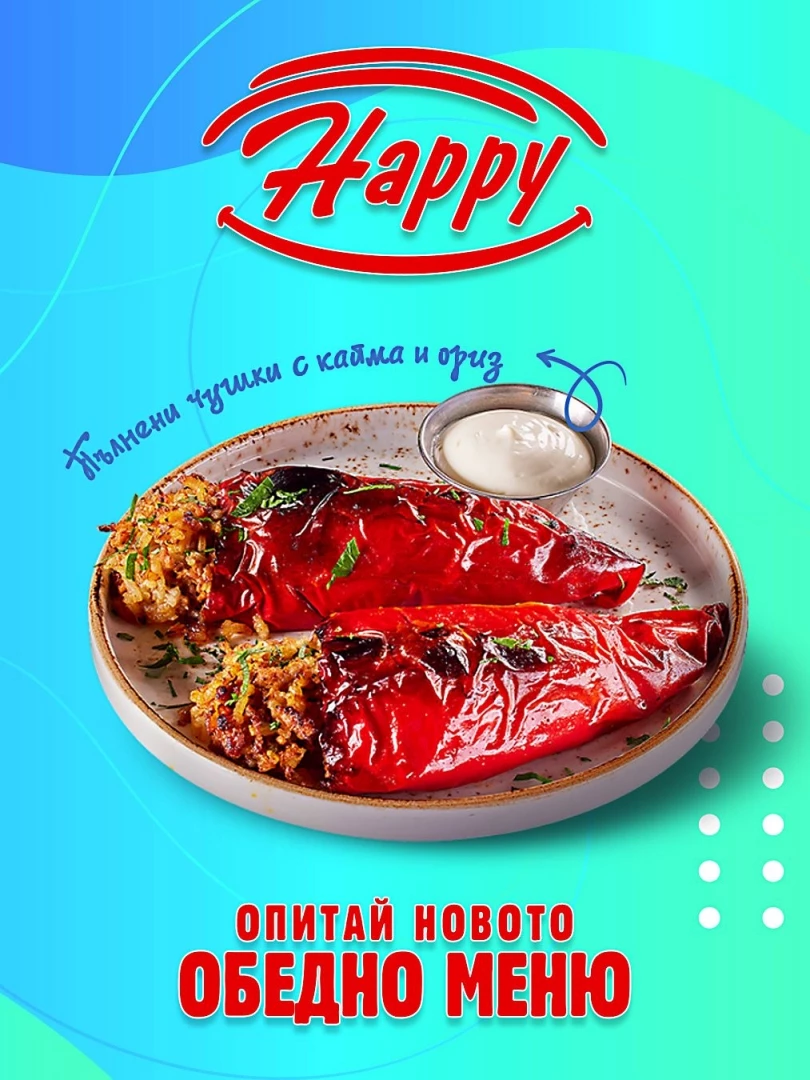 Всеки делничен ден до 17:00 часа ни очакват леки, балансирани и сезонни вкусове, поднесени в характерния за Happy модерен стил. Всички те са внимателно подбрани, така че да носят уют и наслада дори в най-забързаните ни моменти. Можем да се стоплим отвътре с апетитните печени чушки сиврия с магданоз, чесън и копър – идеалното пикантно предястие за студените дни – или да изберем Златния карфиол с хрупкава текстура и екзотични подправки, които подчертават естествения му вкус. Любителите на класиката пък ще оценят постния боб – едно от задължителните ястия за зимата, което ни носи домашен уют и спомени. Ако пък сме в настроение за нещо по-нестандартно и интернационално, знаем, че в Happy винаги можем да разчитаме на страхотно суши. Менюто предлага свежи постни сетове с авокадо, манго, краставици и още много неустоими комбинации.