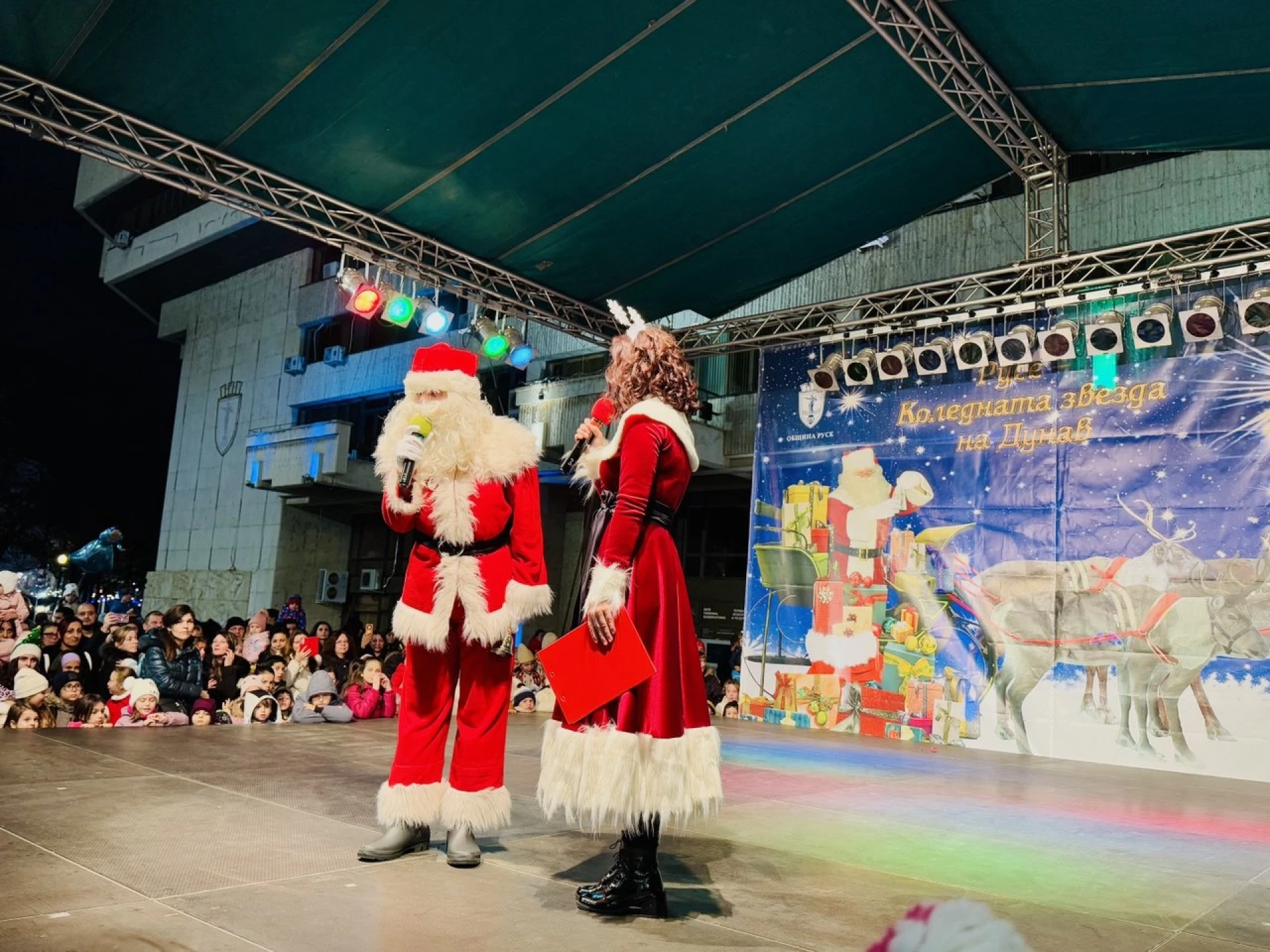 С тържествен концерт пред сградата на Община Русе тази вечер бяха запалени светлините на Коледната елха и бе поставено началото на коледно-новогодишните събития в града. Стотици жители и гости на Русе се събраха, за да посрещнат Дядо Коледа и Снежанка. Кметът Пенчо Милков даде официалния старт на тържествата. Празничната програма, подготвена от Общинския детски център за култура и изкуство, започна с изпълнения на възпитаниците на Детската вокална група „Слънце“, които поздравиха публиката със зимни и коледни песни. Квартет „Слънце“ представи тематична коледна композиция, а танцьорите от Детско-юношеския фолклорен ансамбъл „Зорница“ зарадваха публиката със своите изпълнения.