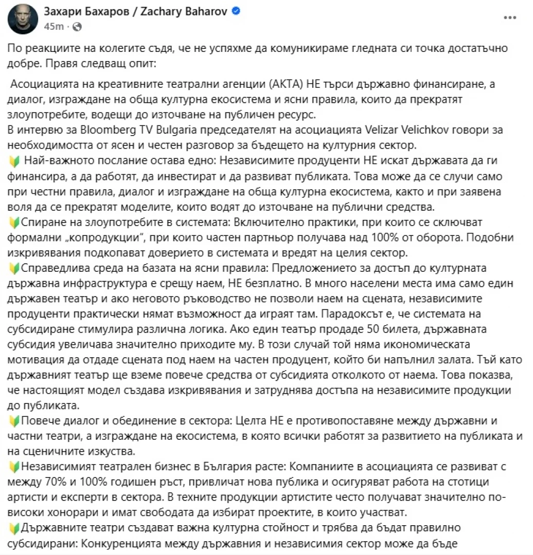 Бахаров пише, че Асоциацията на креативните театрални агенции (АКТА) "НЕ търси държавно финансиране, а диалог, изграждане на обща културна екосистема и ясни правила, които да прекратят злоупотребите, водещи до източване на публичен ресурс". Той добавя, че целта на независимите продуценти не е държавата да ги финансира, а "да работят, да инвестират и да развиват публиката. Това може да се случи само при честни правила, диалог и изграждане на обща културна екосистема, както и при заявена воля да се прекратят моделите, които водят до източване на публични средства".