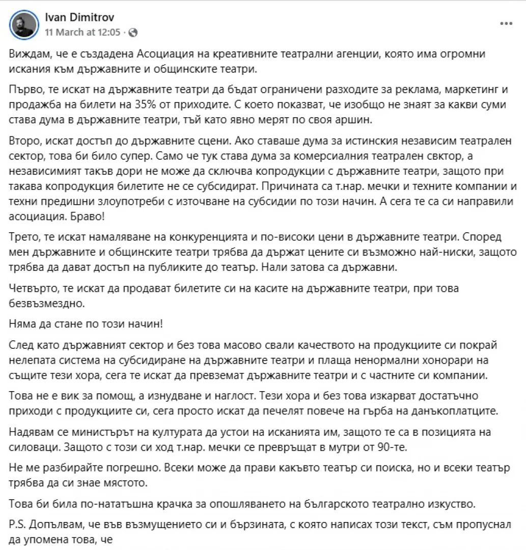 Драматургът и писател Иван Димитров публикува мнение в своя Facebook профил, в което изразява личното си възмущение от това, че частните организации зад Асоциацията, "искат на държавните театри да бъдат ограничени разходите за реклама, маркетинг и продажба на билети на 35% от приходите. С което показват, че изобщо не знаят за какви суми става дума в държавните театри, тъй като явно мерят по своя аршин." Според Димитров частните театрални агенции искат достъп до държавните сцени. "Ако ставаше дума за истинския независим театрален сектор, това би било супер. Само че тук става дума за комерсиалния театрален сeктор, а независимият такъв дори не може да сключва копродукции с държавните театри, защото при такава копродукция билетите не се субсидират."