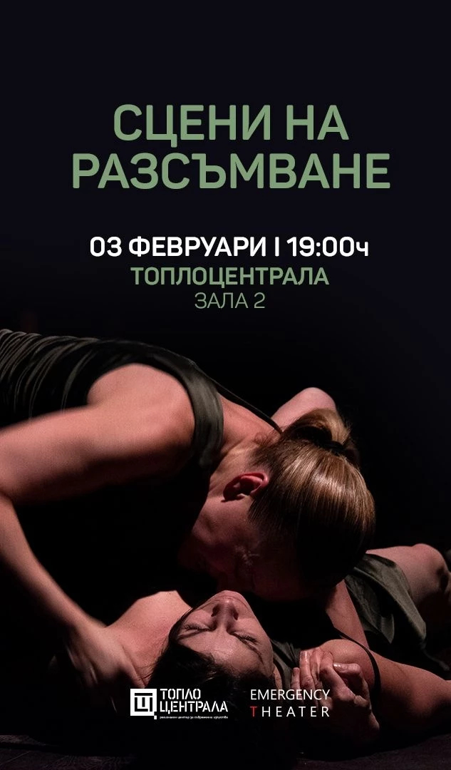 Представление-обръщение към духа на времето, "Сцени на разсъмване" на Emergency Theater е оратория за човешката безпомощност, за страха от загубата на човека до нас, за копнежите и илюзиите, за силата и утехата на пробуждането. Между съня и кризата на предстоящия ден е времето на проясняването, на истината, която изплува между екзистенциалната умора и актуалната тревожност. Как издържаме, как живеем, какво се случва с нас, когато чувствата ни се обръщат навътре и отекват в кухината на тялото. Значима репетиция в този живот е репетирането да изразиш чувствата си, а по-висшето - да съумееш да ги споделиш. Като един голям акт на споделеност поставяме публиката в ролята на желания партньор. Предизвикваме я със сцени на еротичното и смъртта, със сцени на личен срам и блян. Сцената се превръща в лаборатория за психодрама, напълно видима за публиката. Превеждаме я в пространството между самотата, която затваря сърцата и самотата, която дава тласък за нова среща.