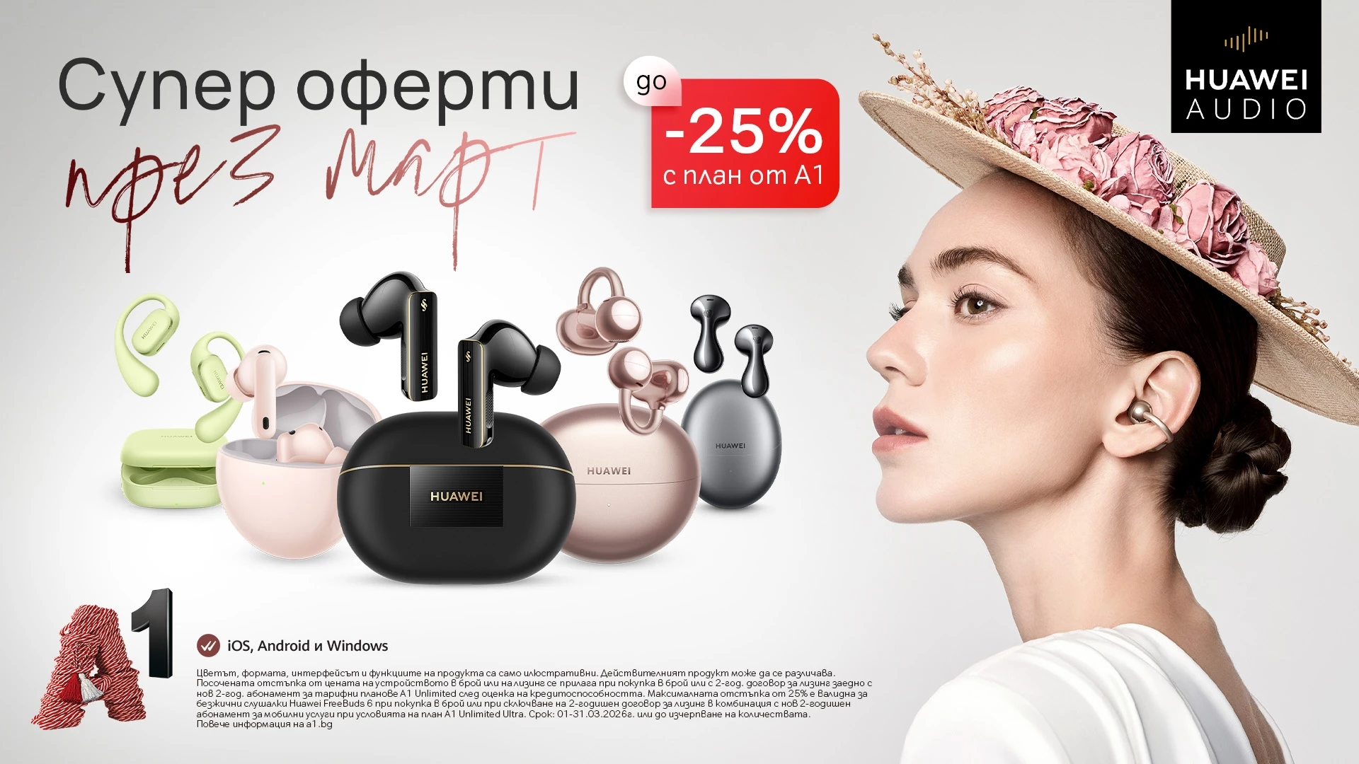 Март носи повече светлина и енергия за ново начало. През целия месец избрани смартчасовници и безжични слушалки Huawei са с до 25% отстъпка в А1. Те съчетават стилен дизайн и интелигентни функции, които се вписват естествено в динамичното ежедневие, като всички модели са съвместими както с Android, така и с iOS. Това е подходящ момент за избор на ново устройство – за повече движение, по-добра организация на деня и звук, който ви следва навсякъде.