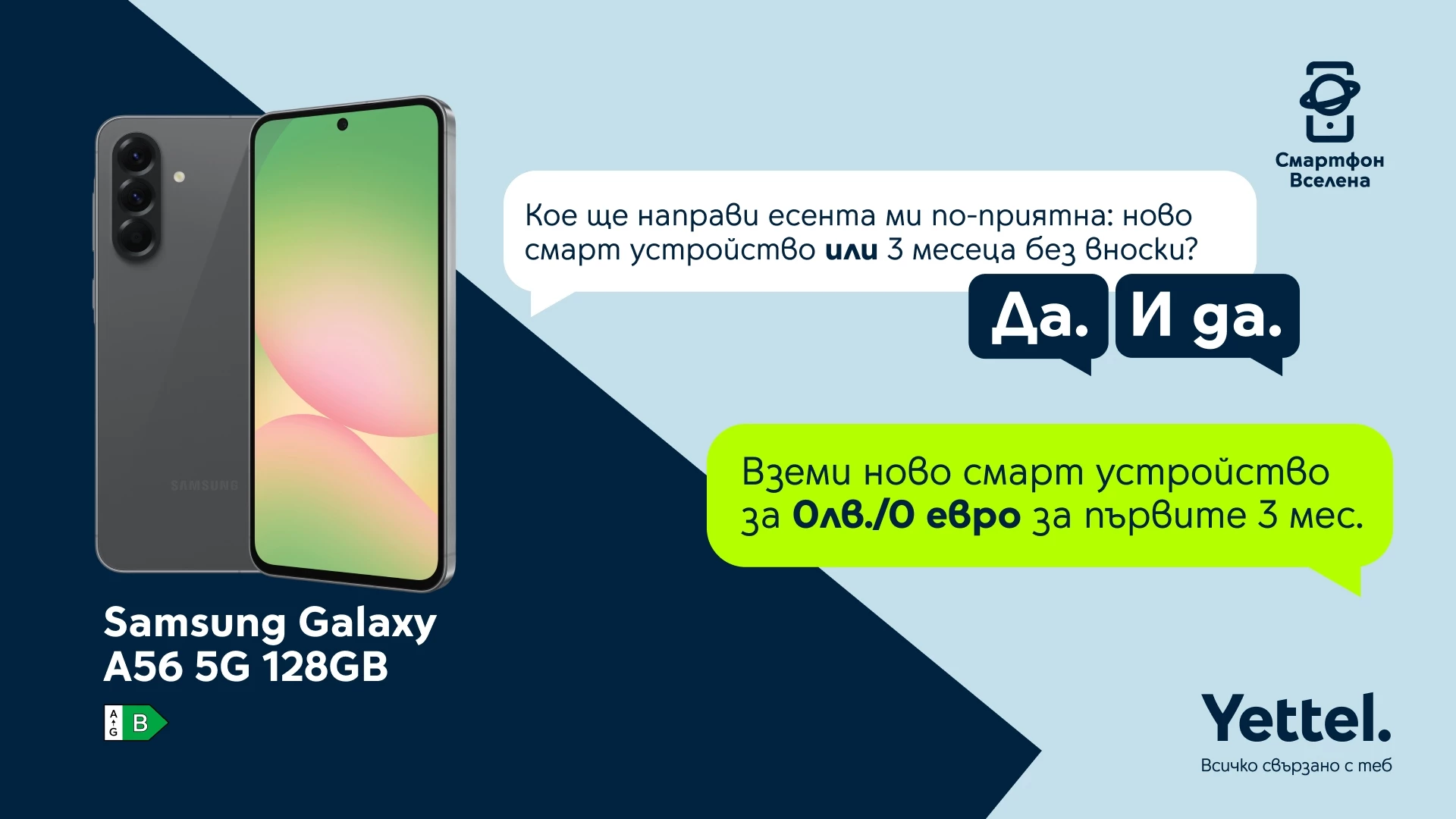 В Yettel всеки може да открие точно този Samsung, който пасва на неговия стил – независимо дали търси достъпен и надежден модел, балансиран смартфон за работа и снимки или устройство с флагмански възможности на по-достъпна цена. Защото с Galaxy A17 5G, A56 5G и S24 FE 5G изборът вече не е въпрос на компромис. А благодарение на пакета услуги „Смартфон вселена“ на Yettel, можеш да се възползваш от още повече удобства, защита и дигитални екстри, които се грижат за новия ти смартфон през цялото време, в което сте заедно. 3 години гаранция вместо стандартните 2, възможност да го защитиш от повреди и дори кражба със застраховката „Смартфон протект“ с включена безплатна първа вноска или да направиш дистанционна диагностика на техническото му състояние напълно самостоятелно. А когато дойде време за раздяла – можеш да го предадеш за рециклиране срещу отстъпка за нов.