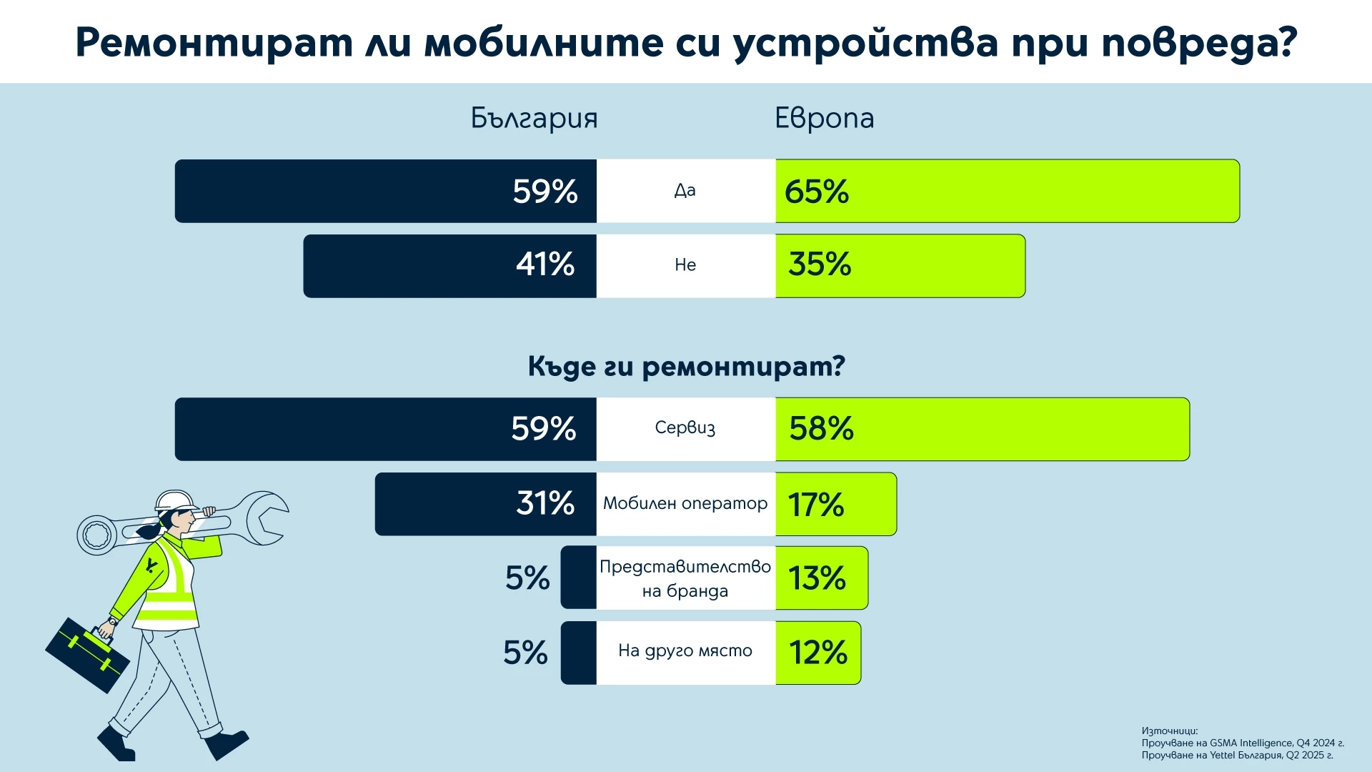 Положителна промяна се вижда и в нагласите на българите за ремонт на устройствата при повреда. Тук е налице пълно съвпадение при намеренията и реалните действия - 60% от хората са готови да ремонтират телефона си, ако се наложи, и същият дял – отново 60%, споделят, че вече са го правили. Прави впечатление, че в 31% от случаите родните потребители разчитат на сервизни услуги, предоставяни от мобилен оператор, а в Европа този процент е едва 17.