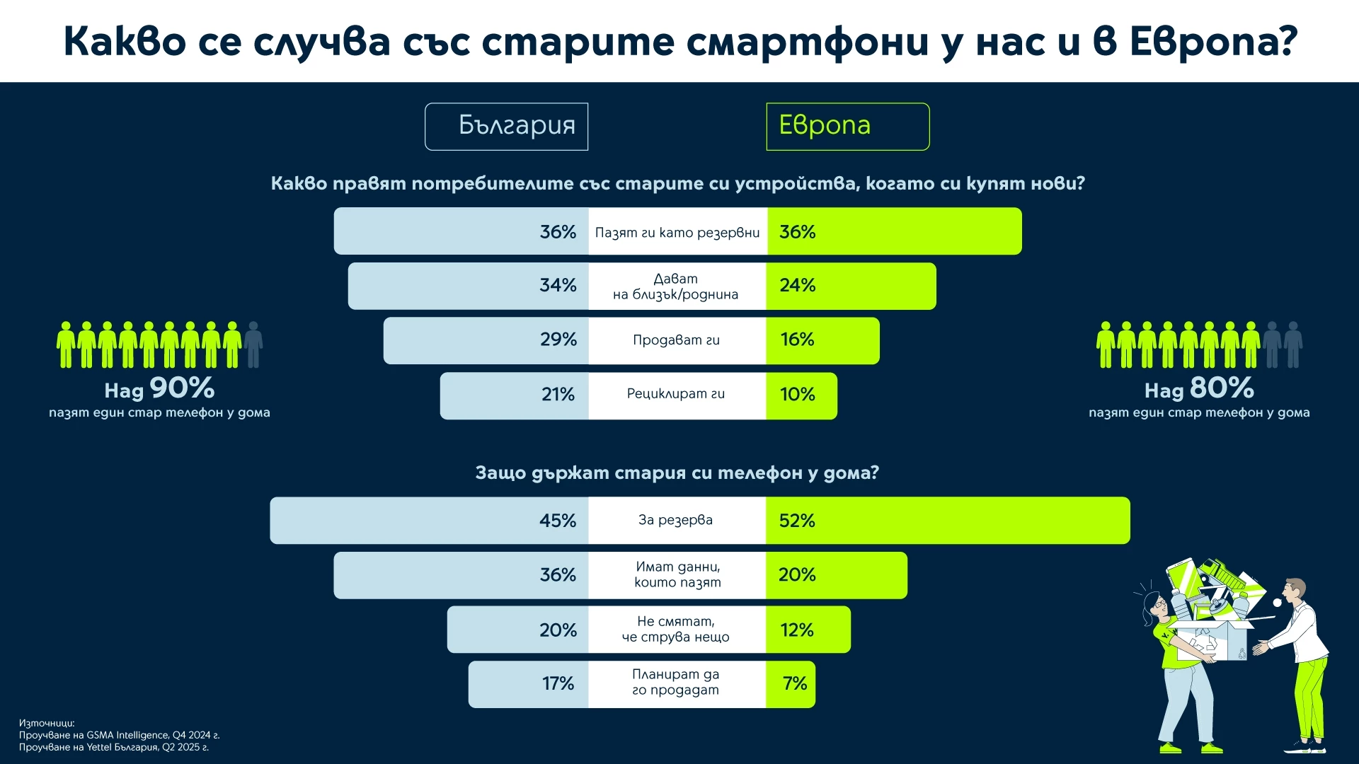 В мотивите на българските и европейски потребители да пазят старата техника най-често се срещат възможността за резервно устройство, наличието на ценни данни или съдържание и предположението, че техниката не струва нищо. Отговора „Не знам какво да правя с него“ дават 16% от българите и 23% от европейците, което подсказва за разлика в осведомеността на двете групи. Все повече потребители у нас са наясно с възможността да предават старите си мобилни апарати в телеком магазините – от 76% през 2023 г. и 79% година по-късно до 82% през 2025 г.