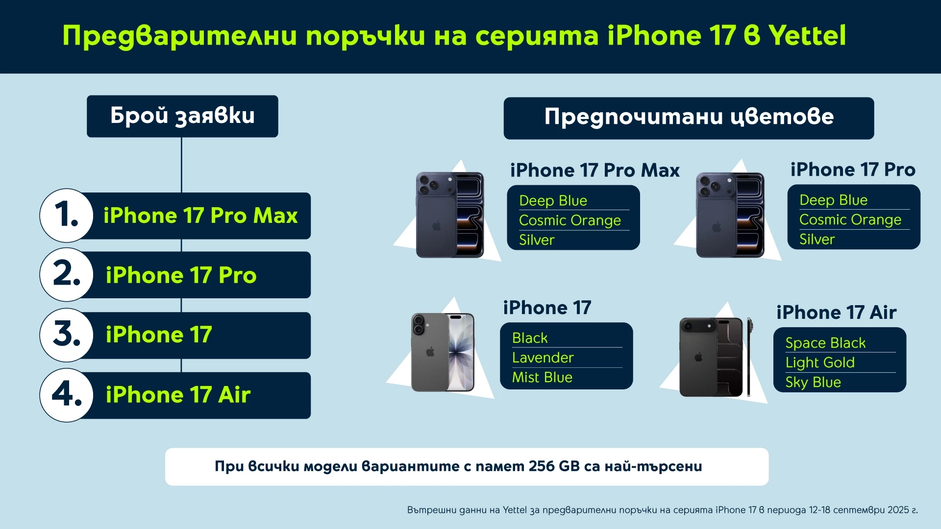 Лидерът по общ обем заявени бройки от всички цветове и памети – Apple iPhone 17 Pro Max предлага обновен дизайн, свръхмощен A19 Pro процесор, подобрена камерна система, най-голямата батерия в iPhone досега, както и опция за цели 2 TB пространство за вътрешно съхранение. Според данните от предварителните поръчки най-търсеният цвят от клиентите на Yettel е Deep Blue, следван от Cosmic Orange и Silver.