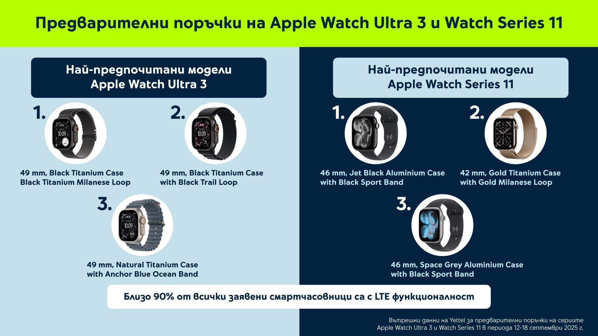 Данните от предварителните поръчки в Yettel показват и повишен интерес към смартчасовниците на Apple спрямо миналата година – близо 40% повече. А почти 90% от заявените устройства са модели, които поддържат LTE функционалност, осигуряваща им автономно използване без нужда от свързаност с телефон.
