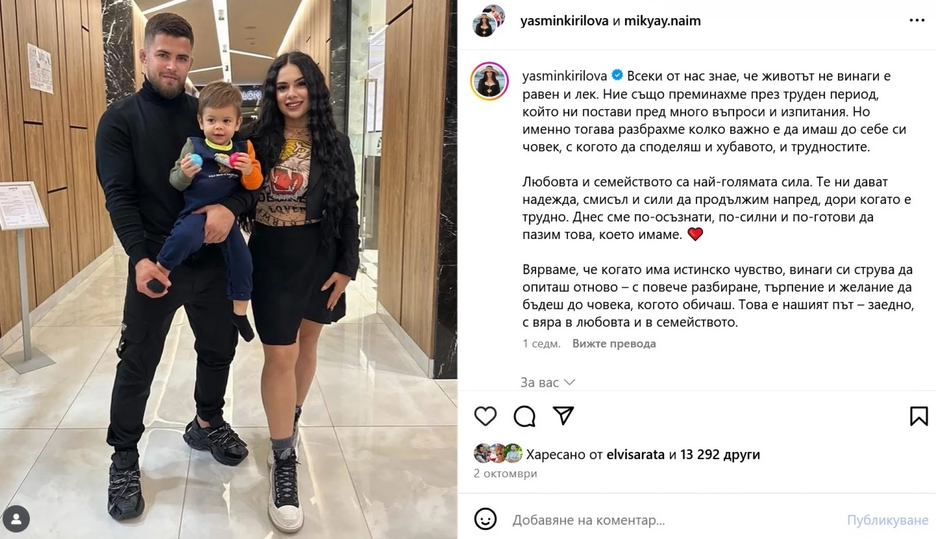 Състезателят по борба Микяй Наим, който участва в миналогодишното издание на "Игри на волята", е преминал през сериозни изпитания, свързани с половинката му Ясмин Кирилова. Това стана ясно от публикация на инфлуенсърката в личния ѝ Instagram профил. Наскоро тя публикува семейна снимка, на която двамата държат и сина си. Въпреки упоритите слухове за раздяла, които се разпространиха през последните дни в интернет пространството, любовта на двойката е успяла да съхрани семейството. А ето и какво сподели половинката на Микяй: