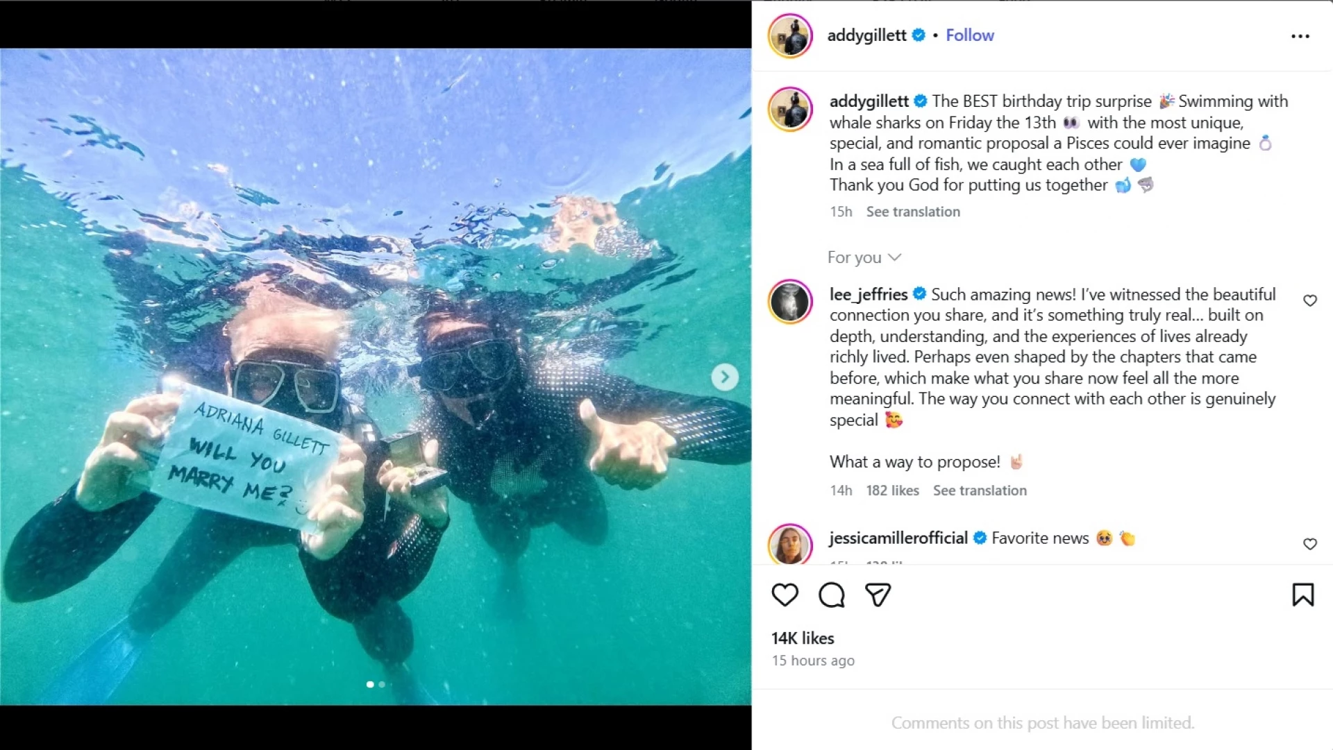 Гилет сподели същата снимка в своя Instagram профил, като добави и повече подробности за предложението. "Най-добрата изненада за рожден ден", написа тя. "Плуване с китови акули в петък, 13-и, с най-уникалното, специално и романтично предложение, което един Риби би могъл да си представи. В море, пълно с риби, ние се хванахме един друг. Благодаря ти, Боже, че ни събра."
