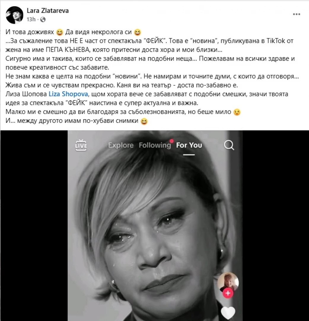 Самата актриса съобщи за грозната постъпка и написа следното: "И това доживях. Да видя некролога си… За съжаление това НЕ Е част от спектакъла "ФЕЙК". Това е "новина", публикувана в TikTok от жена на име ПЕПА КЪНЕВА, която притесни доста хора и мои близки…". Златарева запази добрия тон, въпреки че едва ли ѝ е било лесно. Тя добави: "Сигурно има и такива, които се забавляват на подобни неща… Пожелавам на всички здраве и повече креативност със забавите. Не знам каква е целта на подобни "новини". Не намирам и точните думи, с които да отговоря… Жива съм и се чувствам прекрасно. Каня ви на театър - доста по-забавно е."