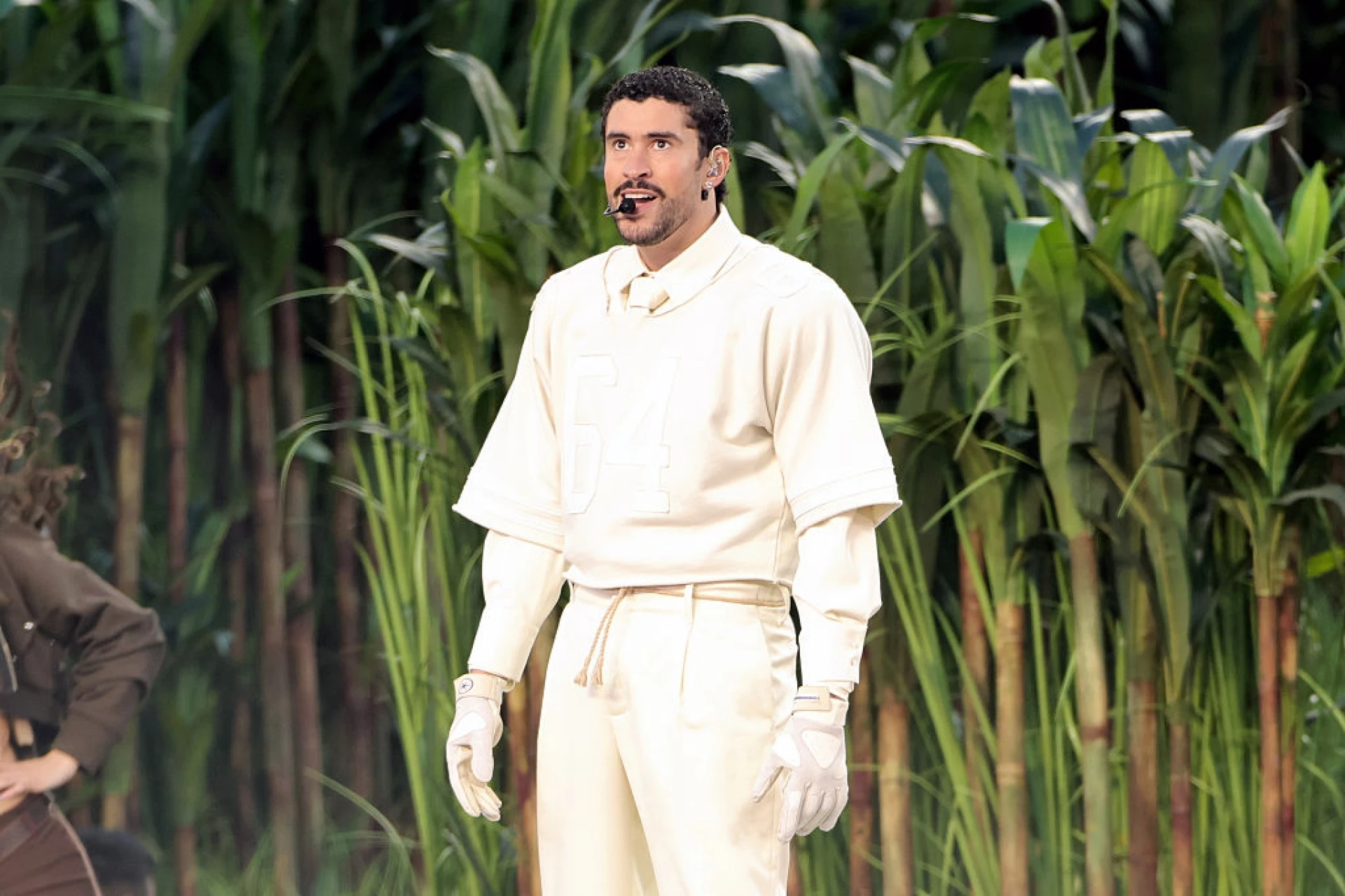 Облечен в кремавобял костюм и маратонки в подходящ цвят, Бед Бъни не се отклони от обичайната си непринуденост и поднесе на публиката няколко шеги.