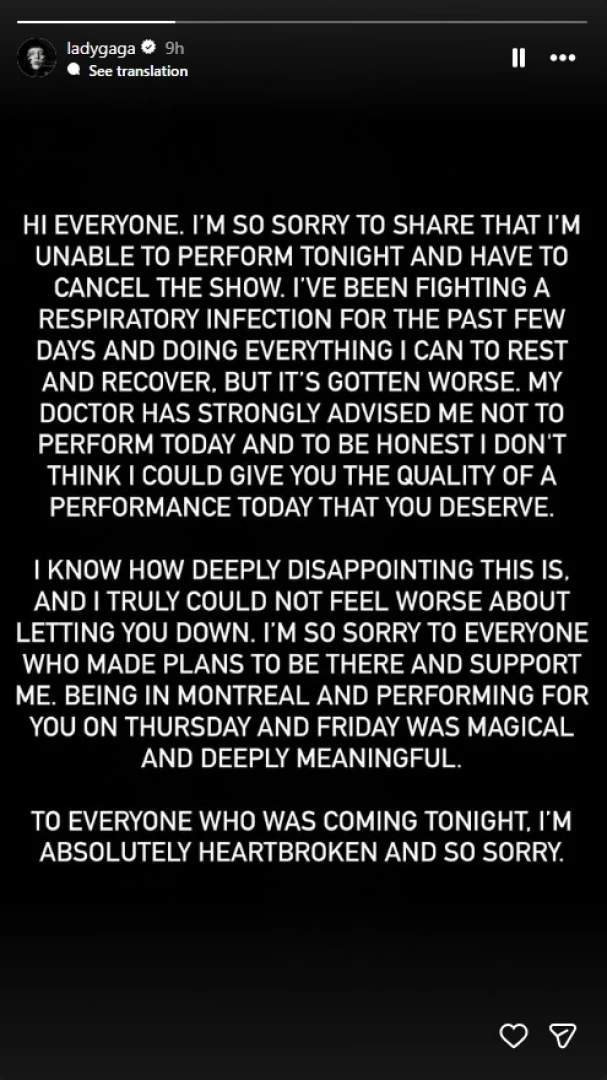 Лейди Гага отмени концерта си в Монреал поради влошено здраве. Няколко часа преди да излезе на сцената в канадския град в рамките на турнето си Mayhem Ball, тя обяви, че се налага да отмени концерта си, след като се е разболяла от респираторна инфекция. "Много съжалявам, че трябва да ви съобщя, че не мога да изляза на сцената тази вечер и се налага да отменя концерта", сподели Гага в Instagram Story на 6 април. "През последните няколко дни се боря с респираторна инфекция и правя всичко възможно, за да си почивам и да се възстановя, но състоянието ми се влоши. Лекарят ми категорично ми препоръча да не излизам на сцената днес и, честно казано, не мисля, че днес бих могла да ви предложа изпълнението, което заслужавате. Много съжалявам пред всички, които бяха планирали да дойдат и да ме подкрепят", допълни певицата.