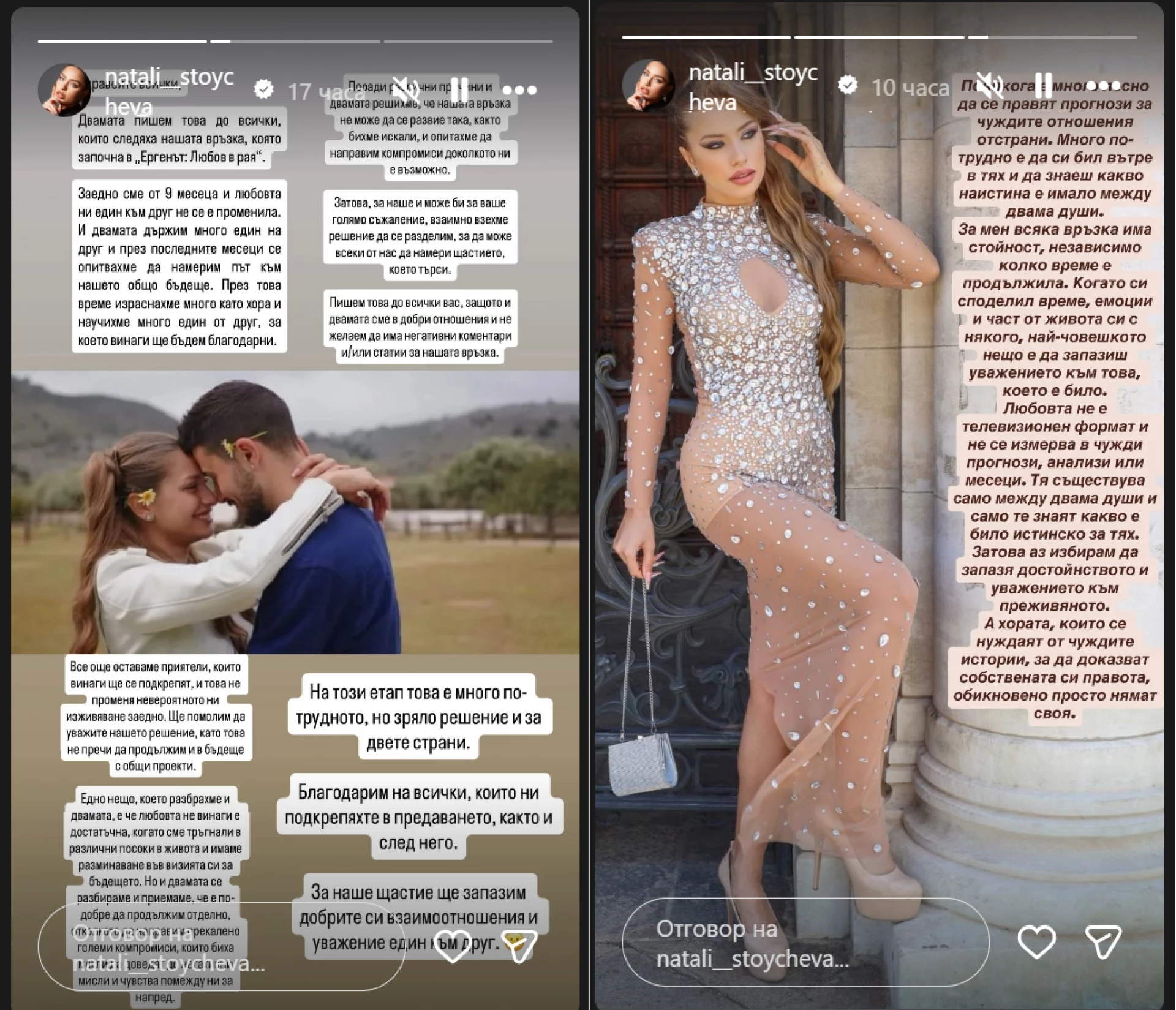 "Понякога в живота идва момент, в който разбираш, че пътищата на двама души просто тръгват в различни посоки. За мен е важно да запазя уважението към човек, който в даден момент е бил мой избор и част от живота ми. Когато си споделял време, емоции и моменти с някого, вярвам, че е честно към себе си и към него да запазиш това уважение, независимо как се развиват нещата след това. Да, имали сме хубави моменти и сме се обичали по свой начин. Именно затова смятам, че най-зрялото решение е да продължим напред с благодарност за преживяното, а не с негативни чувства", написа Натали.