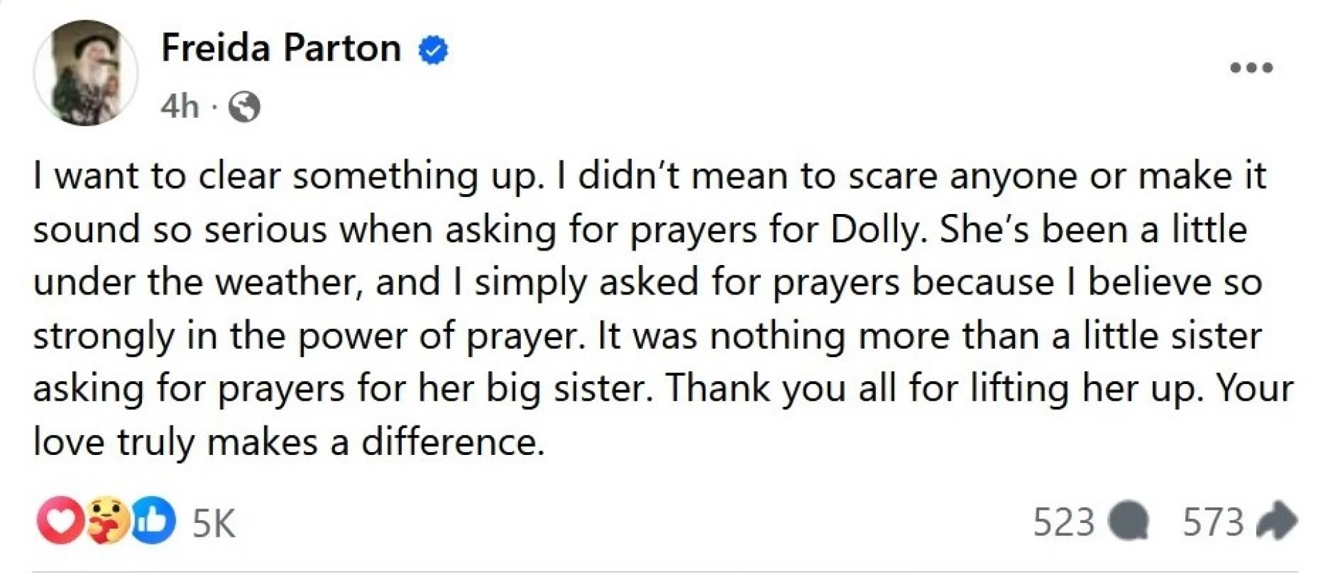 „Снощи бях будна цяла нощ и се молех за сестра ми Доли. Мнозина от вас знаят, че напоследък тя не се чувства най-добре. Наистина вярвам в силата на молитвата и се обръщам към всички, които я обичат по света, да станат молитвени воини и да се молят заедно с мен“, написа Фрида Партън във Facebook.