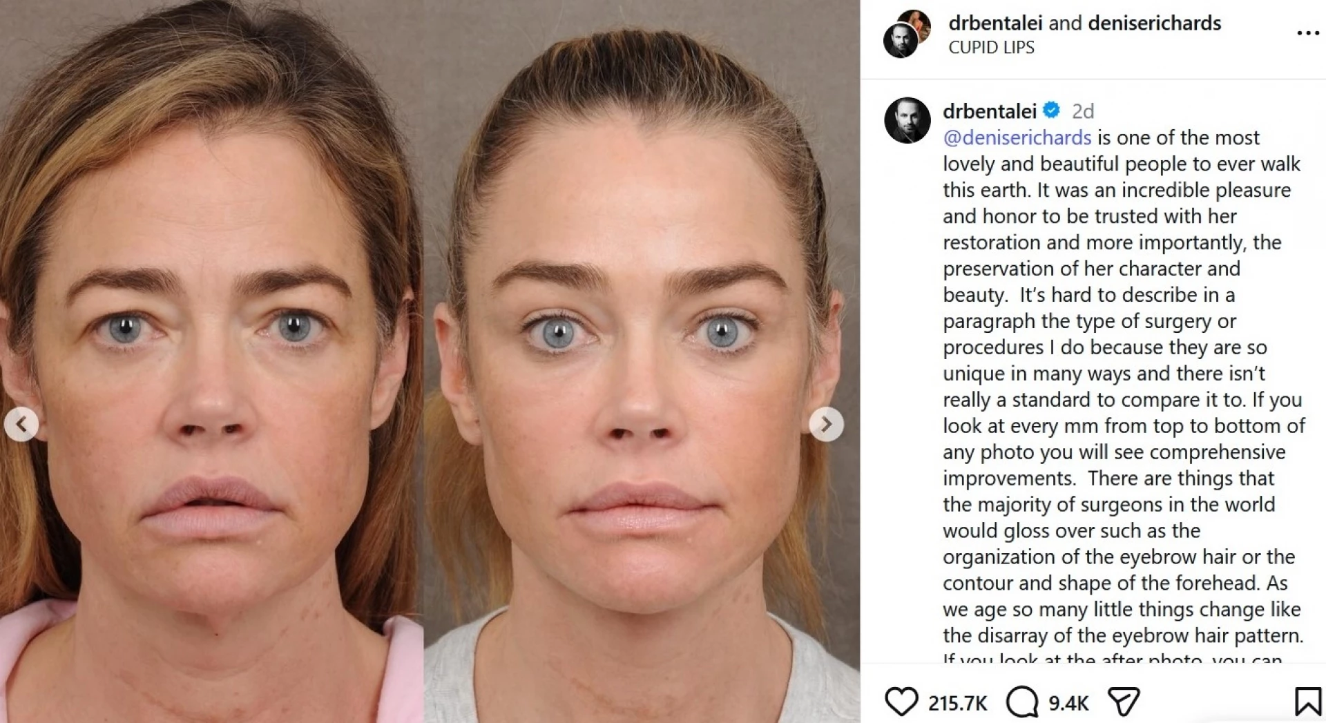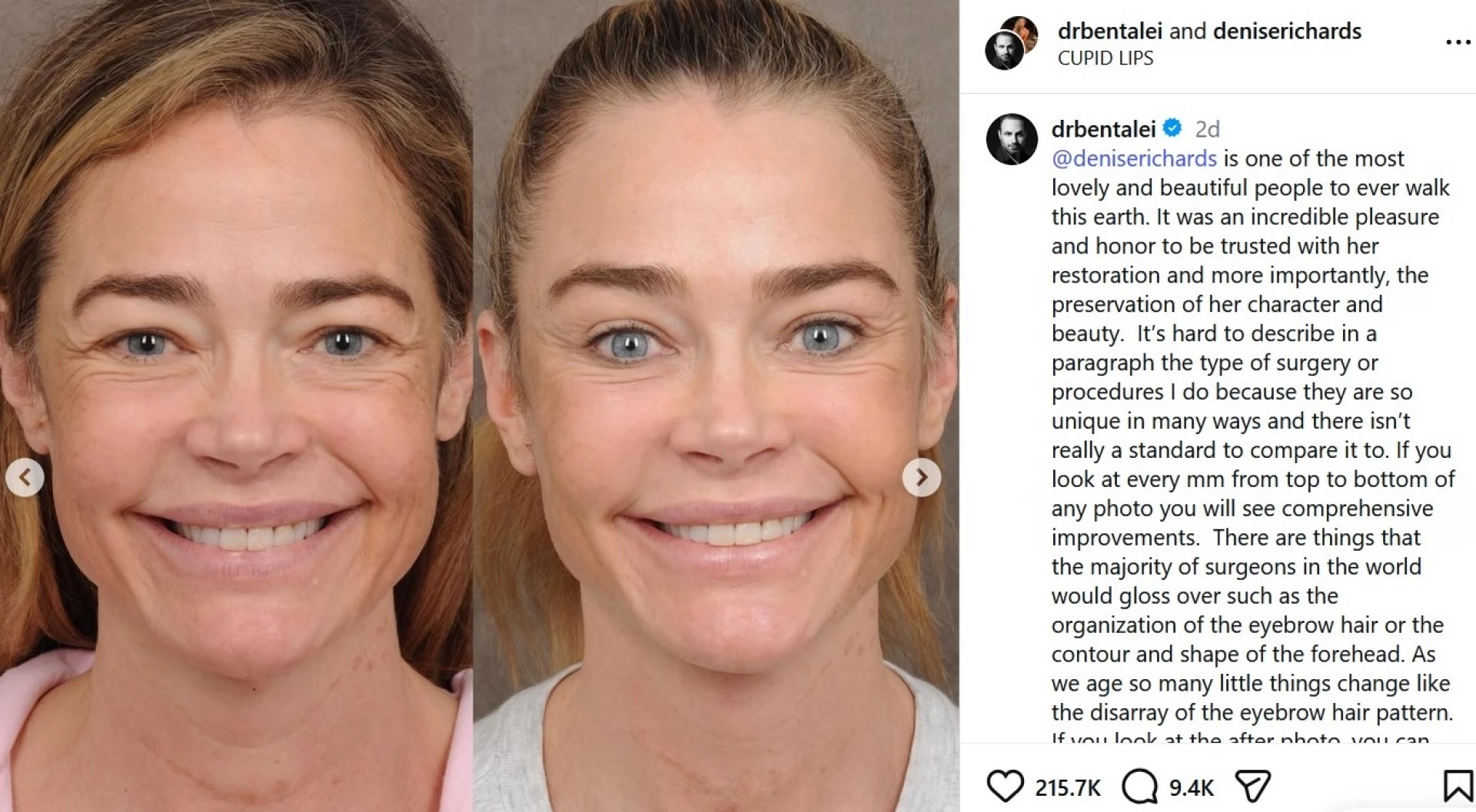 Денис Ричардс продължава да бъде откровена относно скорошния си фейслифт, като споделя и снимки "преди и след". 55-годишната блондинка и нейният пластичен хирург, д-р Бен Талей от Бевърли Хилс, Калифорния, публикуваха снимки една до друга, показващи резултатите от фейслифта, на който актрисата и риалити звезда се е подложила осем месеца по-рано, в обща публикация в Instagram в събота, 21 март.
