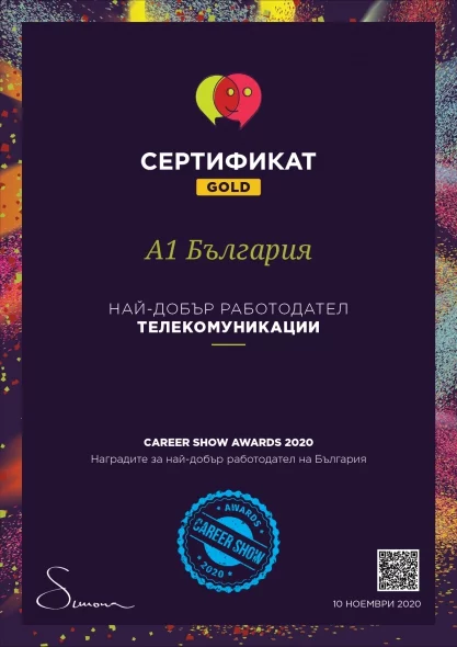 А1 е най-добрият работодател в сектора на телекомуникациите в страната. Компанията спечели първо място в категорията на престижния конкурс Career Show Awards 2020. Усилията на А1 да създаде благоприятна среда за професионално развитие получиха признание в още три от категориите в конкурса – „Стратегия за управление на кризи“, „Вътрешно събитие“ и „Стратегия за здраве и уелнес“.