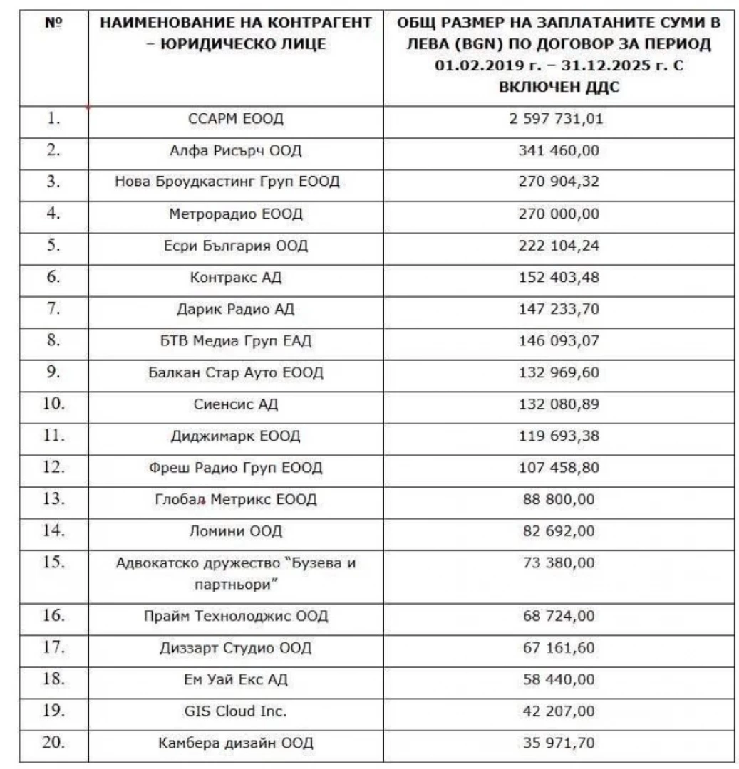 Най-големият получател е фирма ССАРМ ЕООД, която е получила 2,6 млн. лева – почти половината от всички средства. Останалите пари са разпределени между медийни групи, социологически агенции, IT компании, рекламни студиа и консултанти.